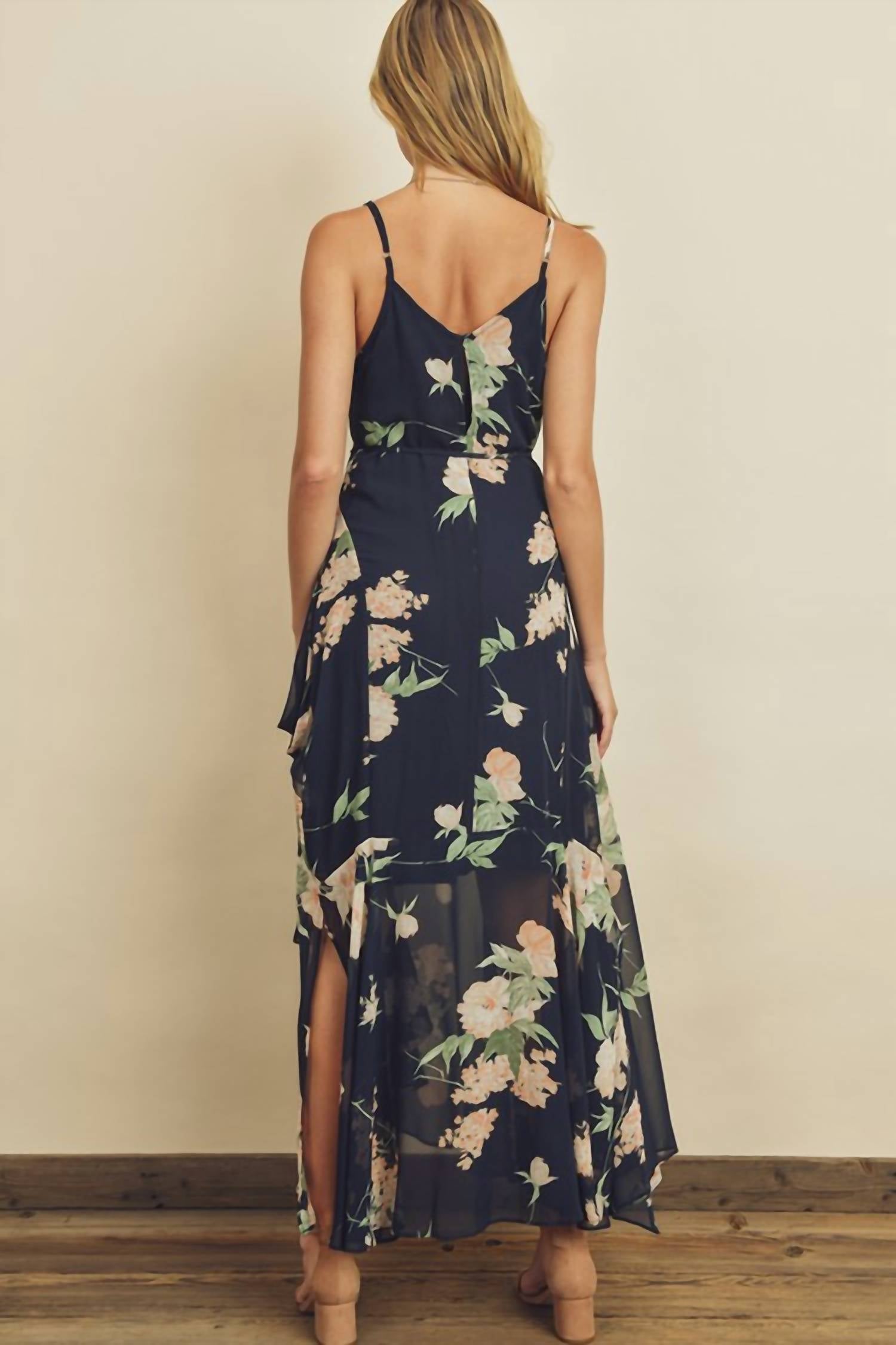 Who doesn't love a good maxi dress? This one you'll be reaching for season after season. Must-have for any destination wedding or special occasion. A-line maxi dress in navy floral features adjustable spaghetti straps and a plunging V-neckline, perfect for a boho chic look. High-fitted waist elegantly transitions into a woven skirt with a flared hem and side slit, ensuring movement and grace. Made from polyester. Requires hand washing.