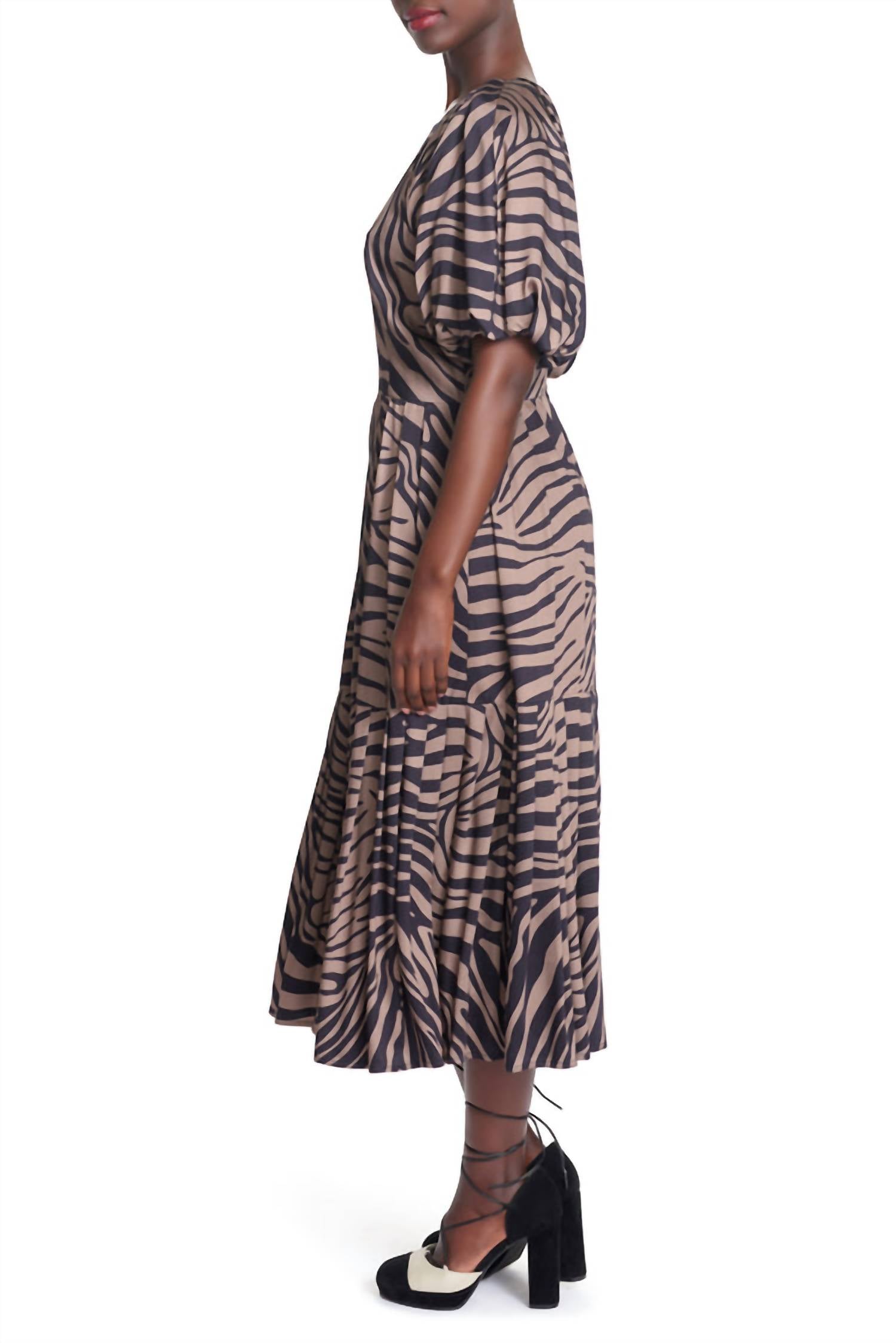 Just add slides or mules and you are good to go. Step out in style with the Zebra Midi Dress by COREY LYNN CALTER, a perfect addition to your spring wardrobe. This women's dress showcases an a-line silhouette in a walnut and black zebra print, accented by puff short sleeves, a high crewneck, and a pleated skirt. Made from premium polyester with 100% satin lining, it features a convenient zip closure and discreet pockets for added functionality. Embrace the trend of quiet luxury with this chic piece, ideal for any dinner party occasion.
