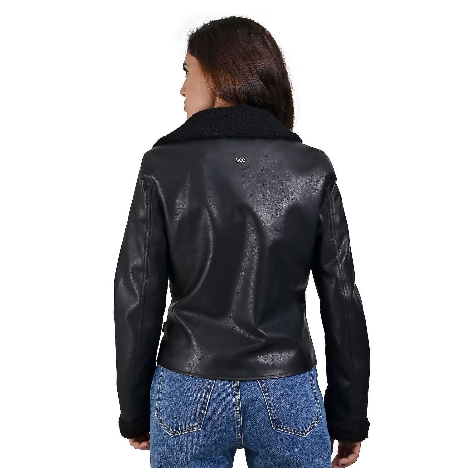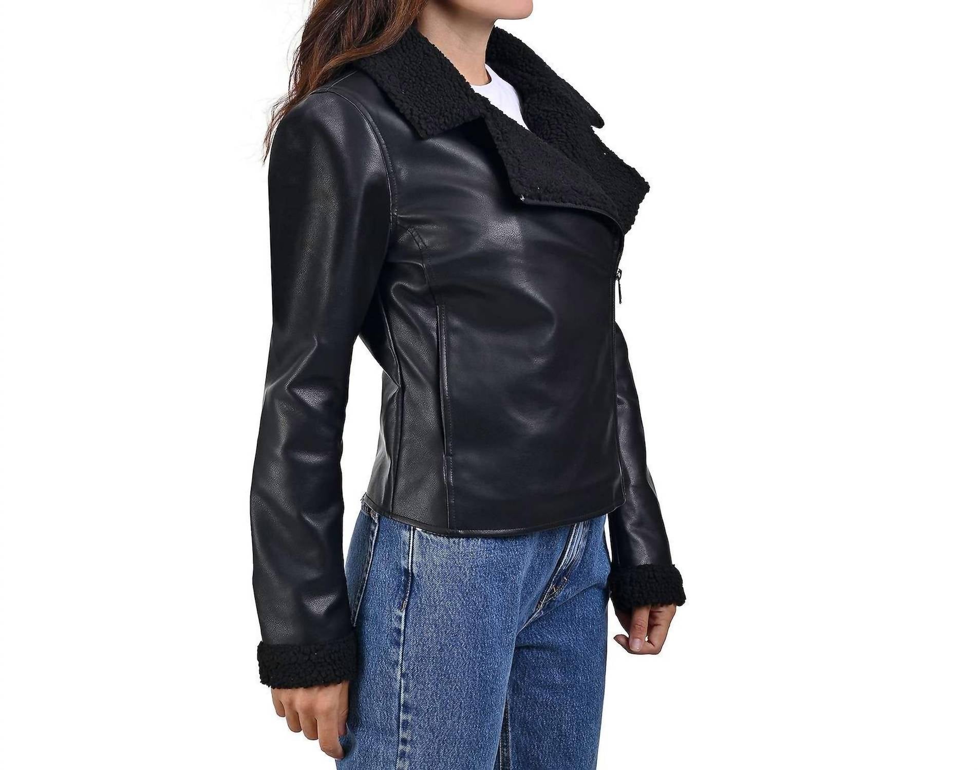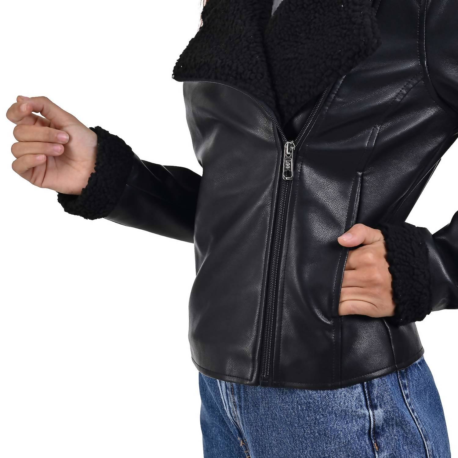 Classic biker style jacket with faux shearling lining. Two side pockets and one inside pocket. Zipper closure with long sleeves. Faux-fur lined for added warmth. Regular fit with a 24 1/2-in. length from shoulder to hem. Designed to hit just below the waist. Midweight construction. Polyester and polyurethane. Dry clean only. Imported.