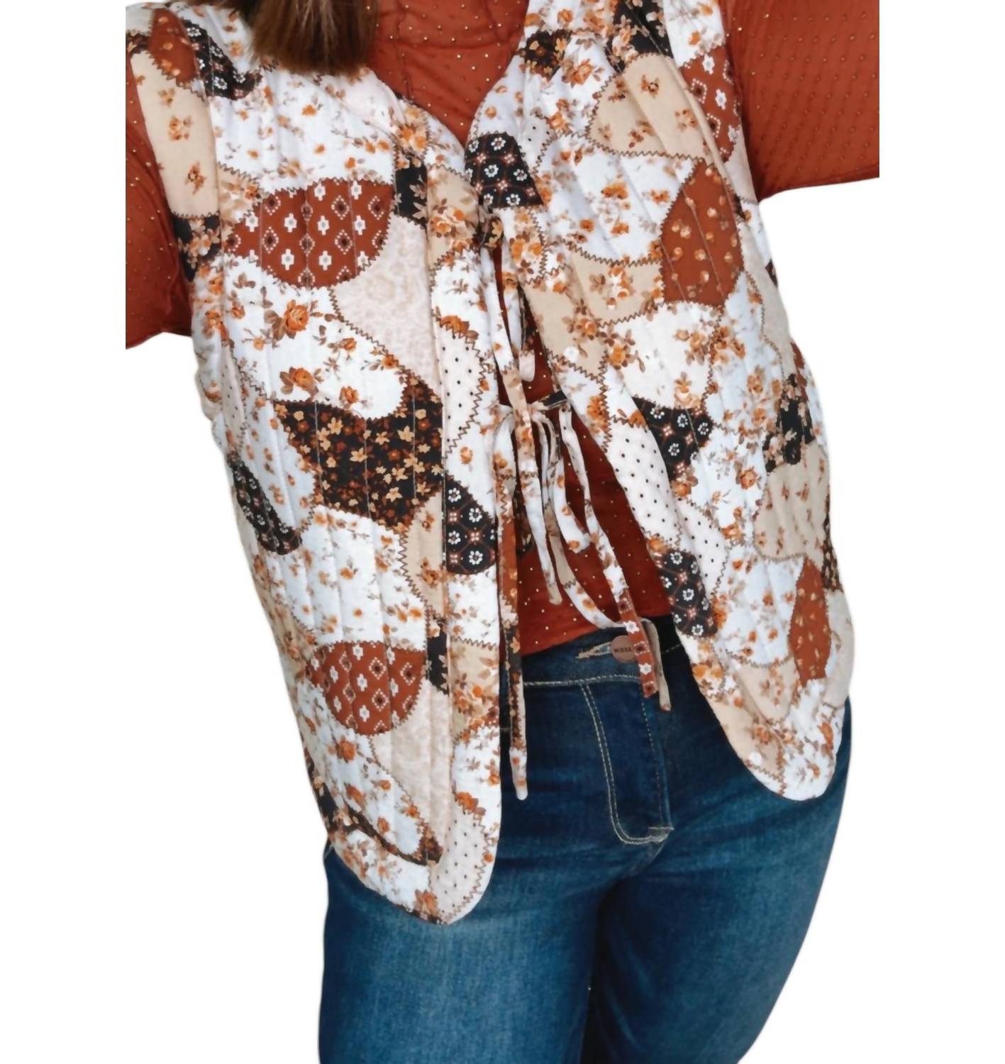 A vest so versatile you can mix and match it with almost any outfit and it will feel brand new every time. Quilted Patchwork Vest. Brown. Floral vest. Vintage patchwork. Front tie. Stylish and warm. Perfect for layering.