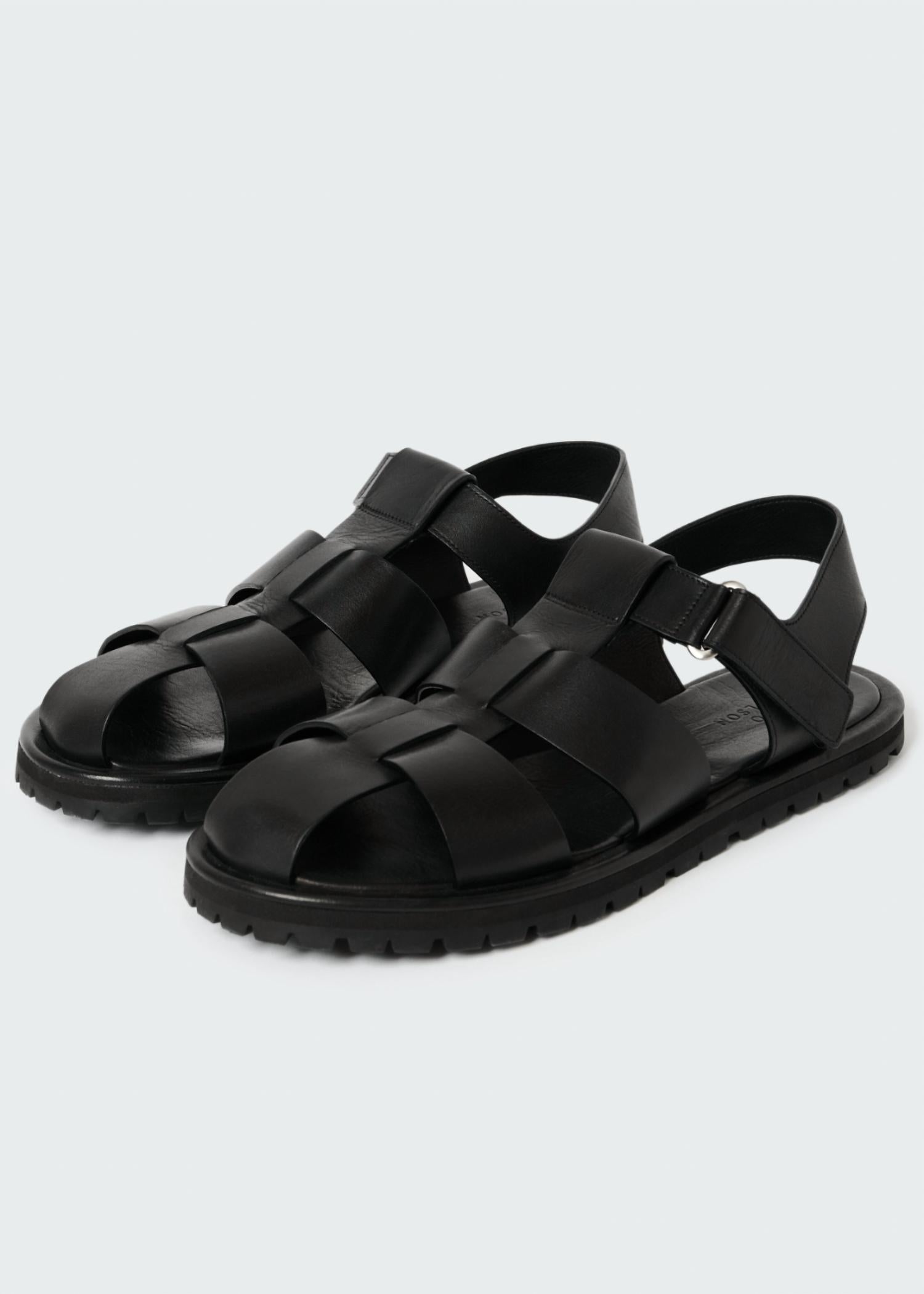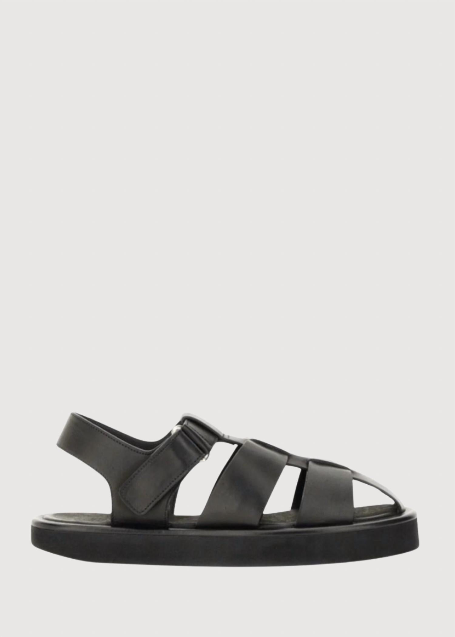 Flowy dresses, cropped pants, and even jumpsuits... this sandal works with them all! Elevate your seasonal style with the Women's Fisherman Sandal from Studio Nicholson, designed for effortless elegance in Black. These sandals feature a leather construction and a Velcro fastening for a secure fit. Enjoy comfort with a cushioned footbed and superior traction thanks to the Vibram rubber outsole. Material: 100% Leather. Care: Remove dirt or oil marks with a clean cloth and use a neutral polish for upkeep. Perfect for vacation or summer outings, they boast a round toe and flat heel, embodying Boho Chic appeal.