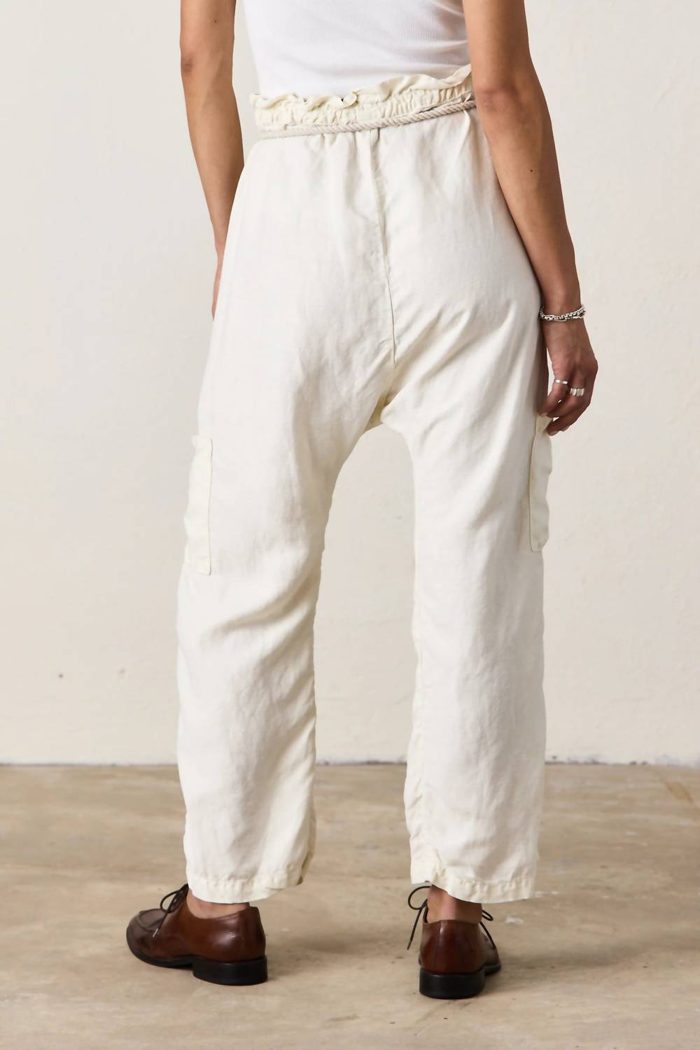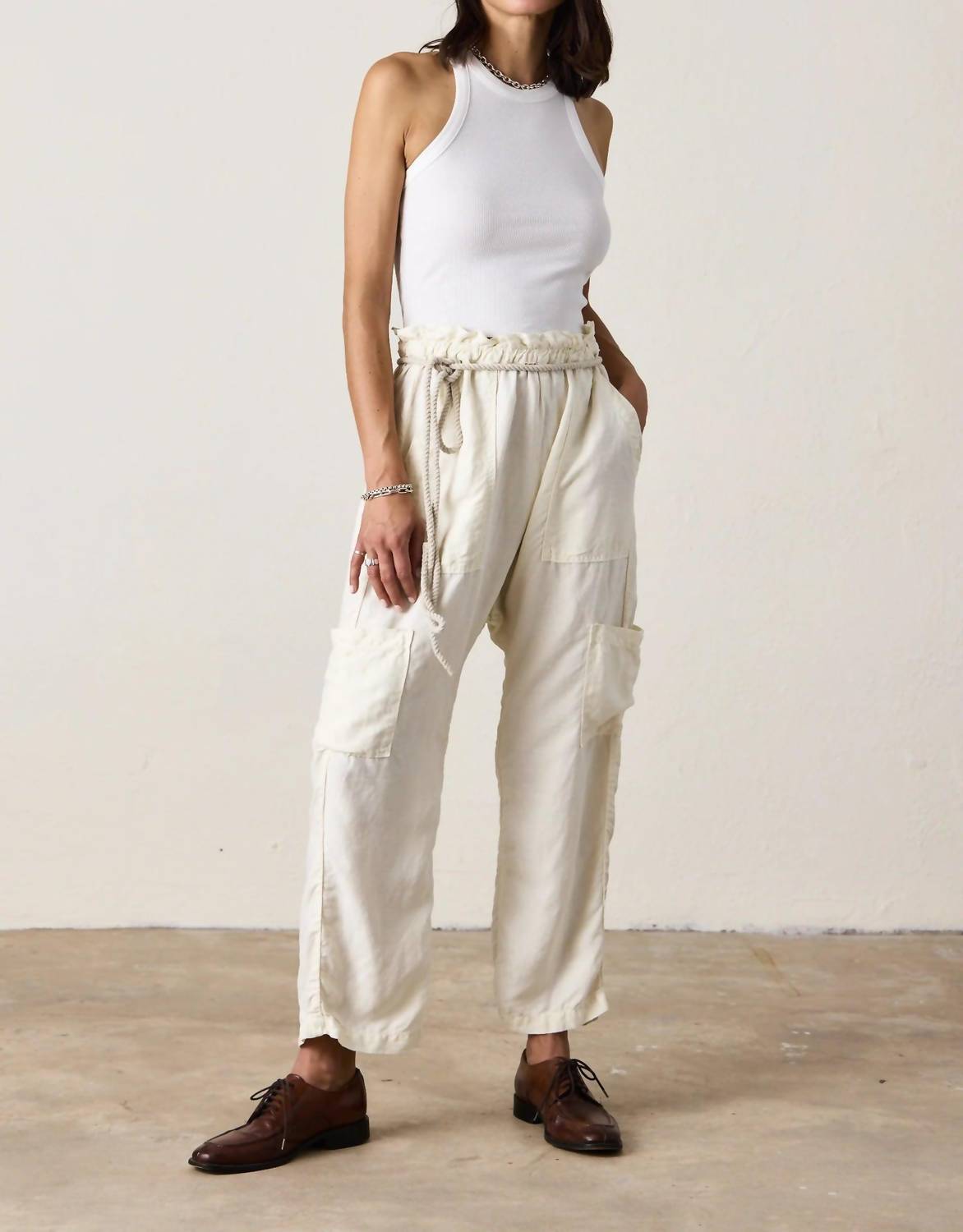 A perfectly tailored straight leg that you'll want in every color! Meet the Shailey Paperbag Waist Pant by NSF, a bestseller crafted for the ultimate flexibility and style. These versatile slouchy pants feature a pull-on closure and can be worn high-waist, mid-waist, or low-waist to suit your preference. Made in Los Angeles with 56% Lyocell and 44% Linen, these pants offer bold patch pockets and sleek side pockets for added functionality. Care instructions include machine washing in cold water, designed to maintain the soft white solid pattern. Flat Measurements for size S include a 14" waist, 16.5" rise, 17.5" high hip, 11.5" thigh, a 24" inseam, and 9" leg opening.