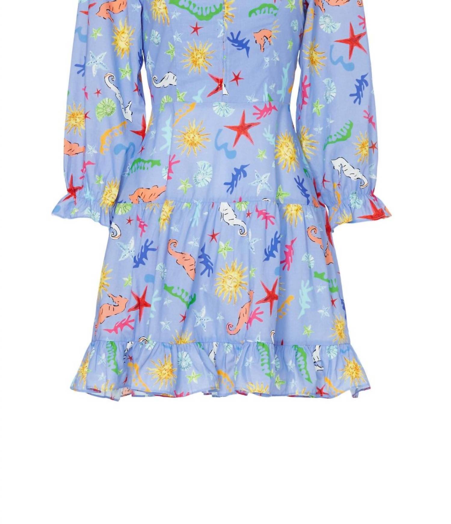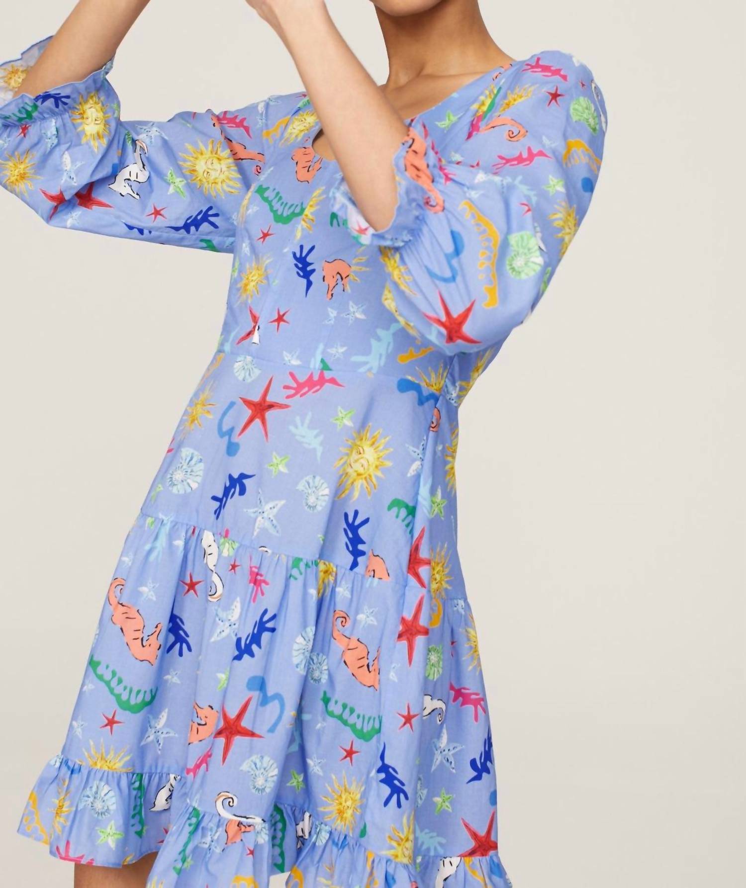 Discover the Ambretta Mini Dress by Rixo, a nostalgic ocean-themed piece perfect for summer. Crafted from 100% cotton, this blue graphic dress features three-quarter sleeves and a flattering hourglass silhouette. It measures 33 inches from shoulder to hemline and comes with a convenient back zipper closure. Care for this imported dress by dry cleaning only.
