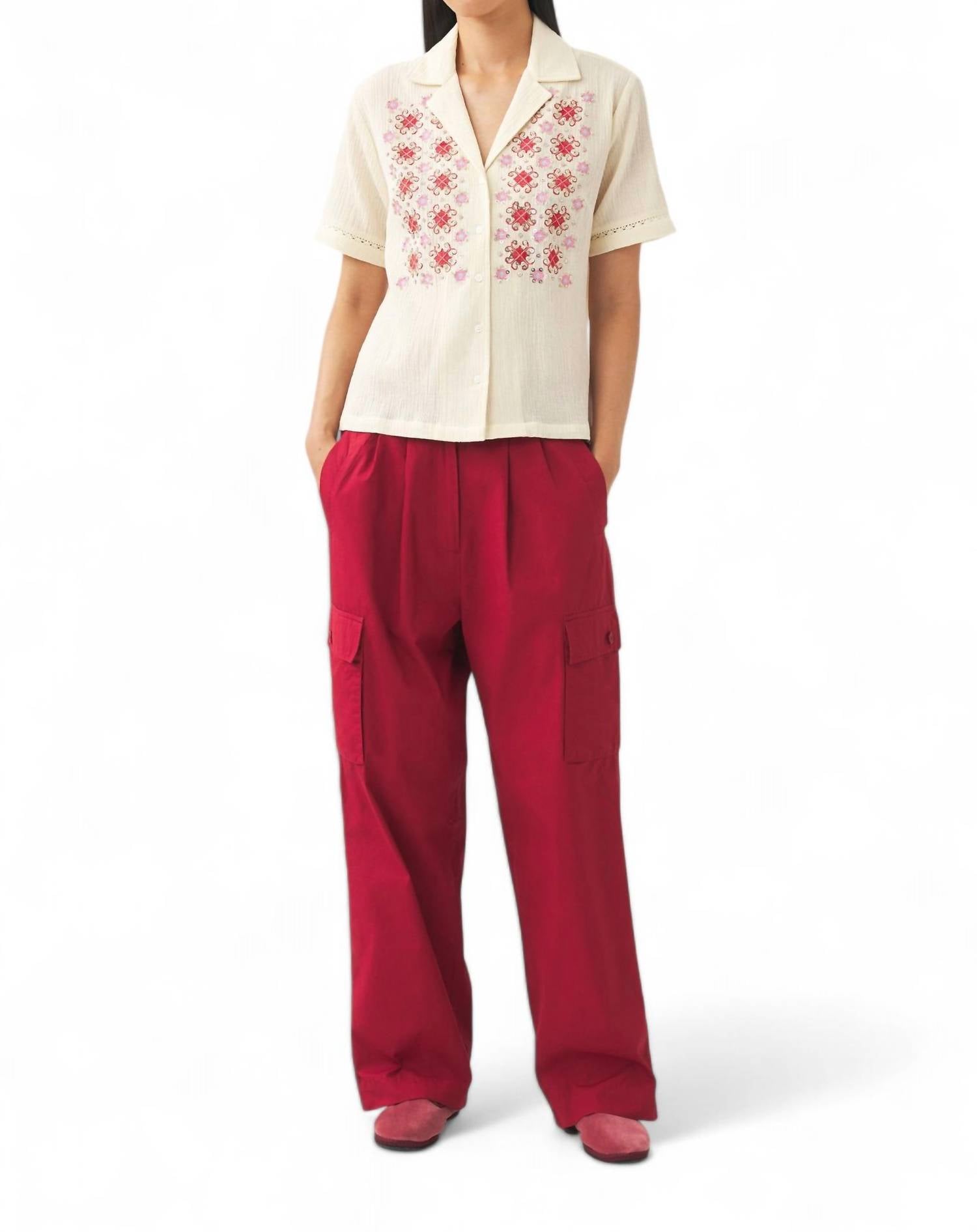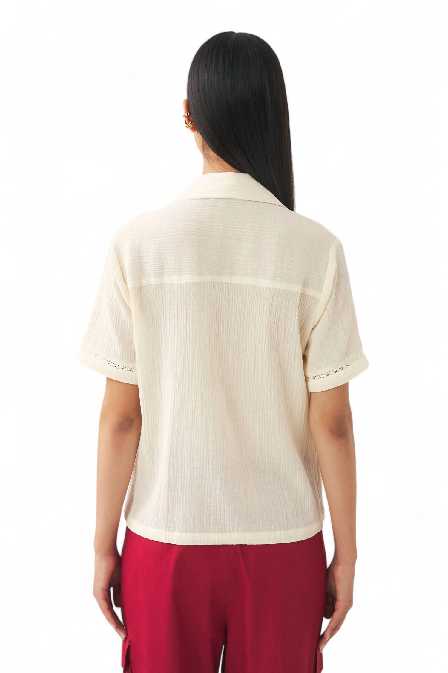 This cotton crepe demi-couture blouse features hand-stitched cross-stitch embroidery, re-embroidered with sequins and beads for added elegance. The sleeves are adorned with hand-embroidered openwork lace details, while a Cuban collar complements the design. Made from 100% cotton crepe, with mother-of-pearl embroidery and buttons, it requires dry cleaning only. For a size EU 38/S, the total length is 24.4 inches.