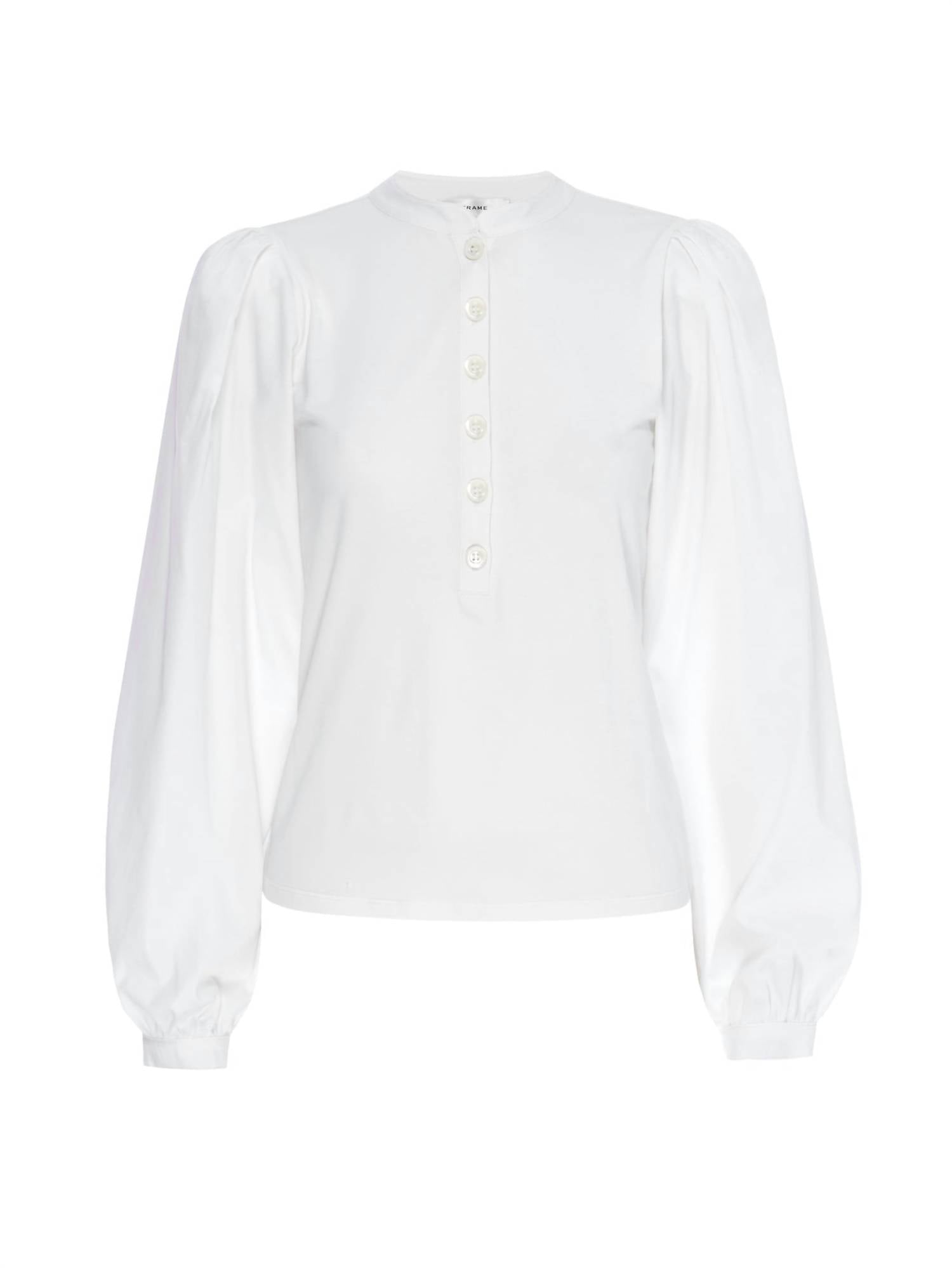 A timeless blouse that will never go out of style. Elevate your workwear wardrobe with the FRAME Femme Puff Sleeve Henley Top, a standout piece in solid white. Crafted from 100% organic cotton, this top features long sleeves and a flattering V-neckline, ideal for engagement occasions. Closure: Button closure. A must-have for the spring season, combining comfort and style effortlessly.