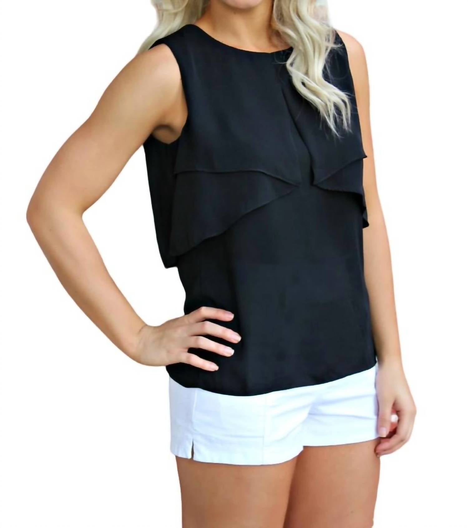 Features an overlay of ruffles and a keyhole button closure in the back. Model is 5'6" wearing a size Small. True to Size. Hand Wash.