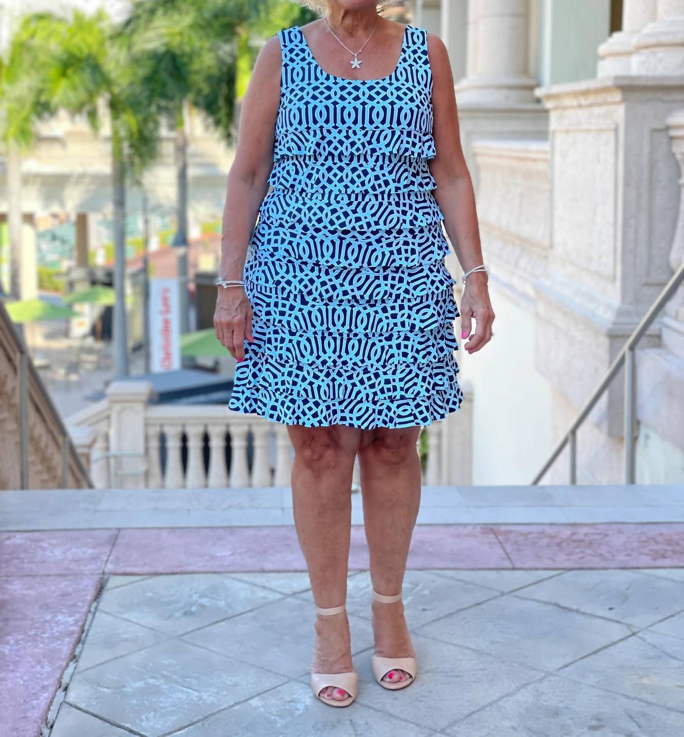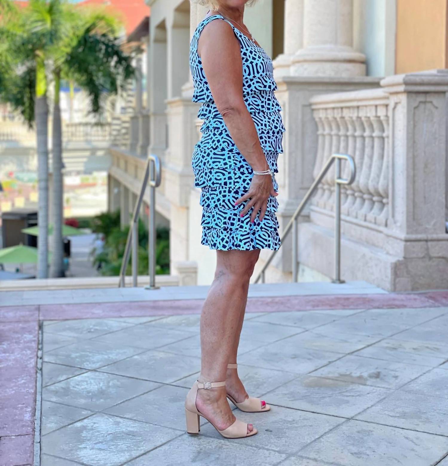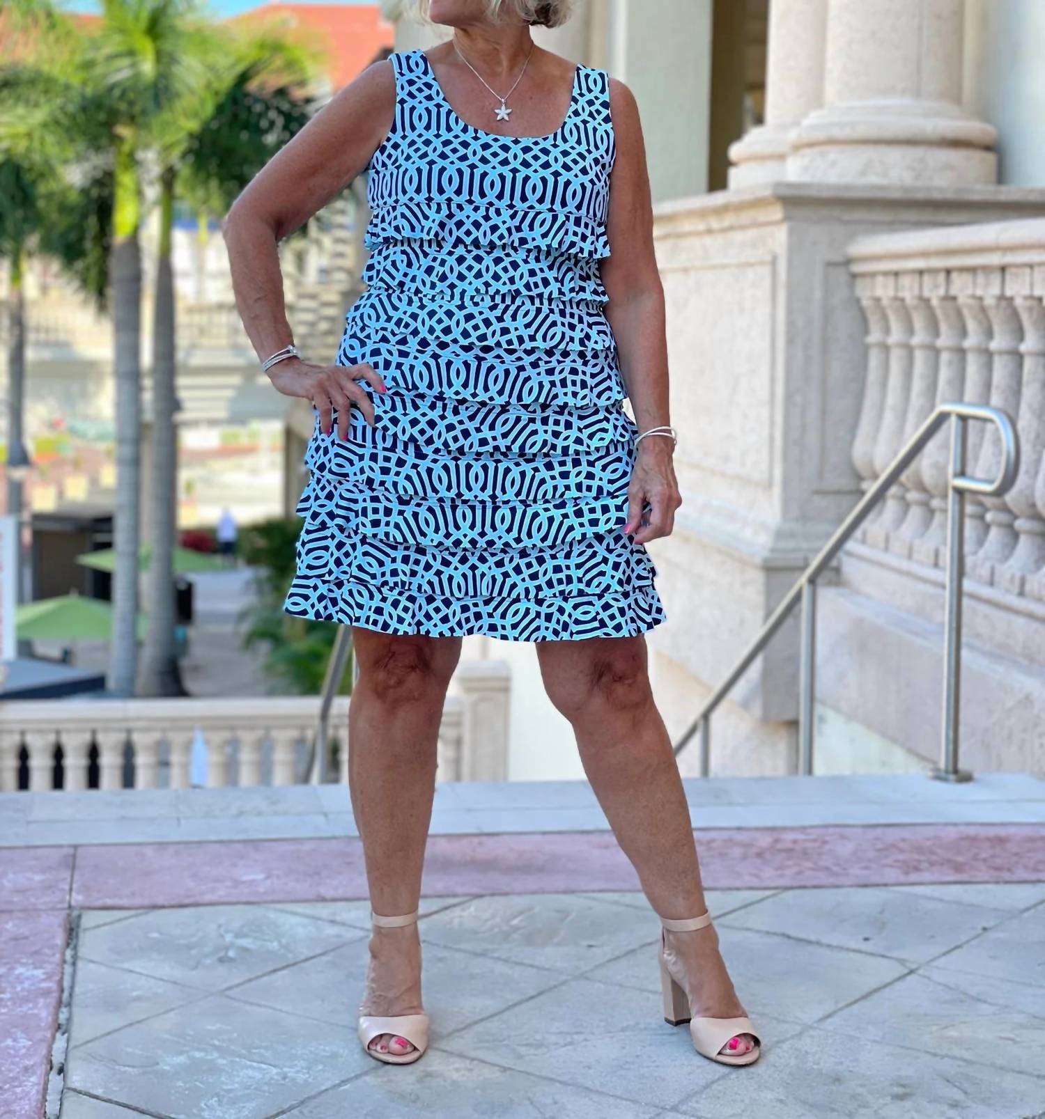A short and breezy dress for those warmer days. Chic mini dress designed for effortless beach style in vibrant blue. Crafted from 92% Nylon and 8% Spandex. Features a geometric pattern with playful ruffles on the front and back. With its 30.5-inch center back length and UPF50+ sun protection, perfect for sunny summer days. Easy to wear with a scoop neckline and pull-on closure, A-line silhouette. Machine washable, ensuring care-free maintenance.