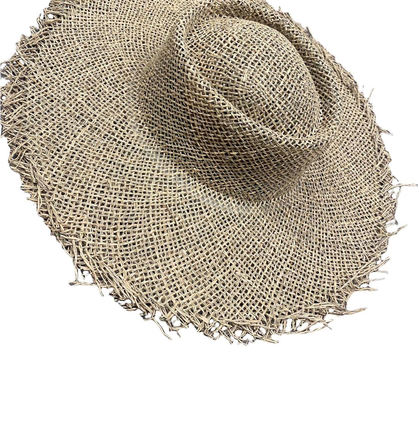 Block the sun in style with this adorable hat that will complement any outfit. Expertly crafted to elevate your style while providing a delightful touch of personality. Exquisite handwoven accessory in a chic beige hue. This hat, crafted from 100% seagrass, features frayed edges and a stylish, stiff wide brim measuring 4.5 inches. Includes an adjustable inner drawstring for a customizable fit. Embrace sustainable style with this elegant and practical piece.