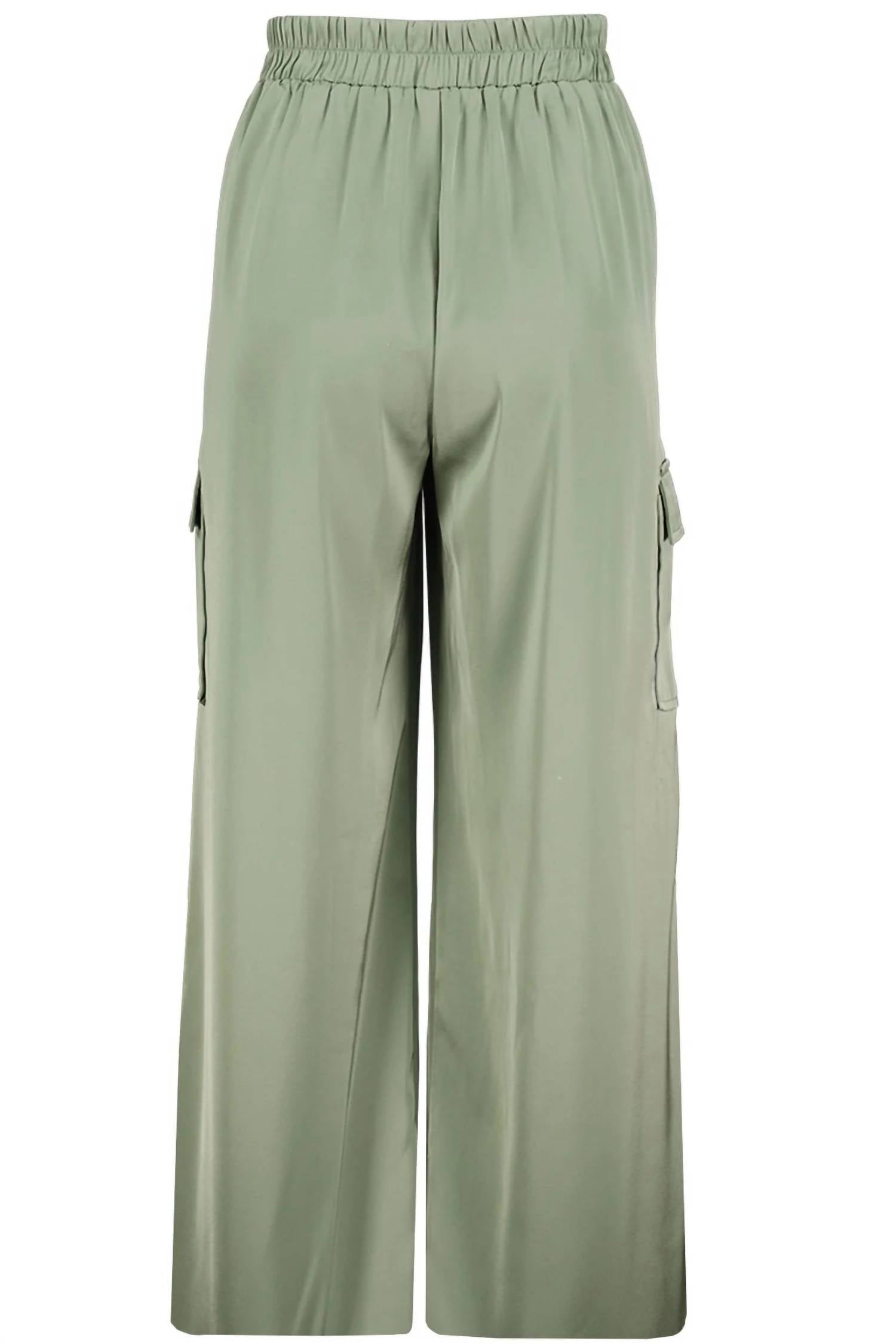 Elevate your travel wardrobe with the Pull-On Satin Cargo Pants by Bishop + Young, curated for the chic and adventurous woman. Crafted with 100% polyester, these green wide-leg pants exude luxury with a smooth satin finish. A pull-on closure and elasticized waist ensure supreme comfort, while side cargo pockets add a utilitarian twist. Care for these by hand washing in cold water and hanging to dry. Model is 5'10", wearing size S.