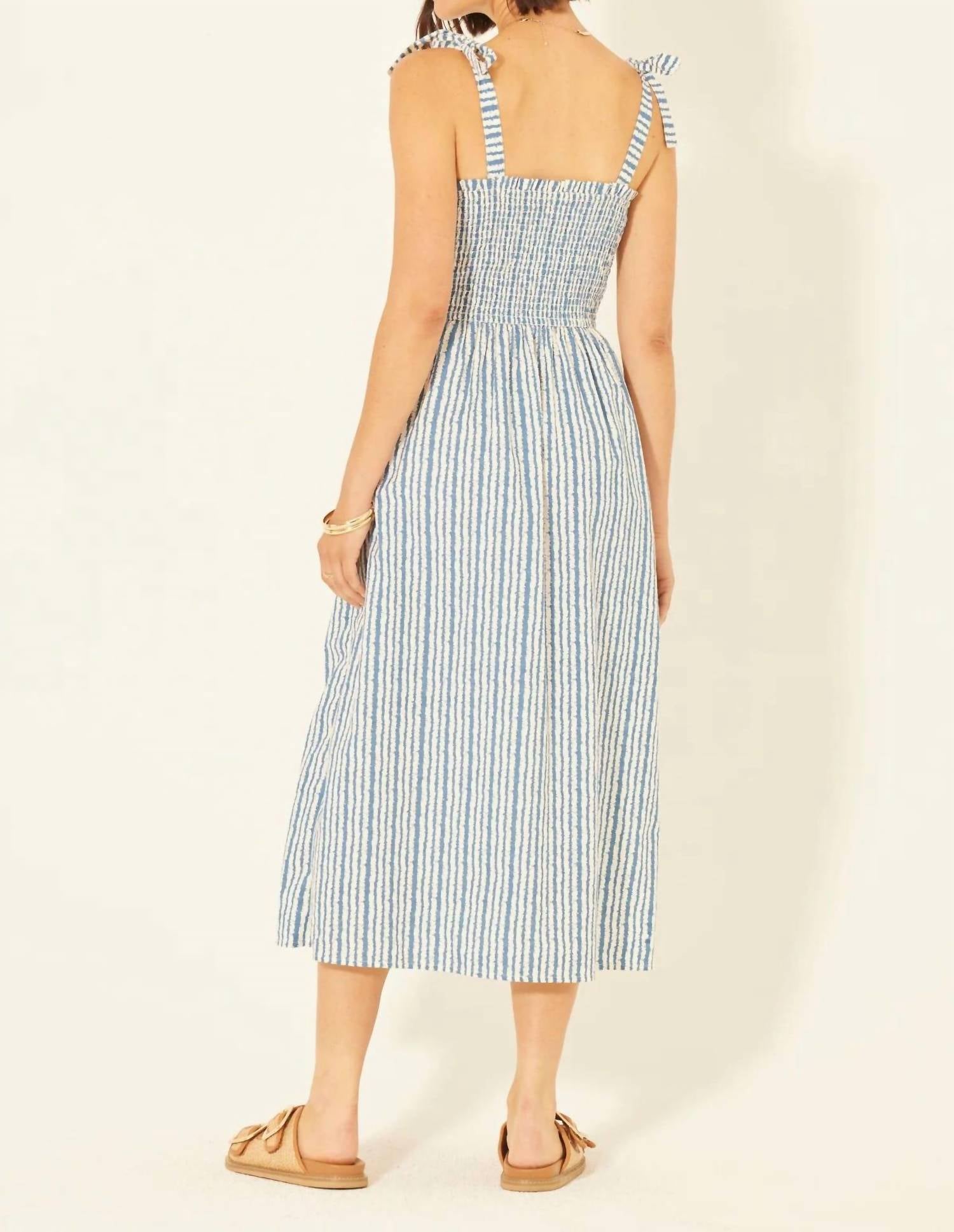 A midi dress so versatile, your options for wearing it are endless. Introducing the Lindsay Midi Dress by BILA77, a perfect blend of style and comfort for your summer wardrobe. This sleeveless dress is crafted from 100% BCI Cotton and features a flattering A-line silhouette in a striking Blue Jasper stripe pattern. Designed with a squareneck and tie closure, it embodies boho chic elegance suited for vacation getaways. Care: Hand wash for long-lasting wear.