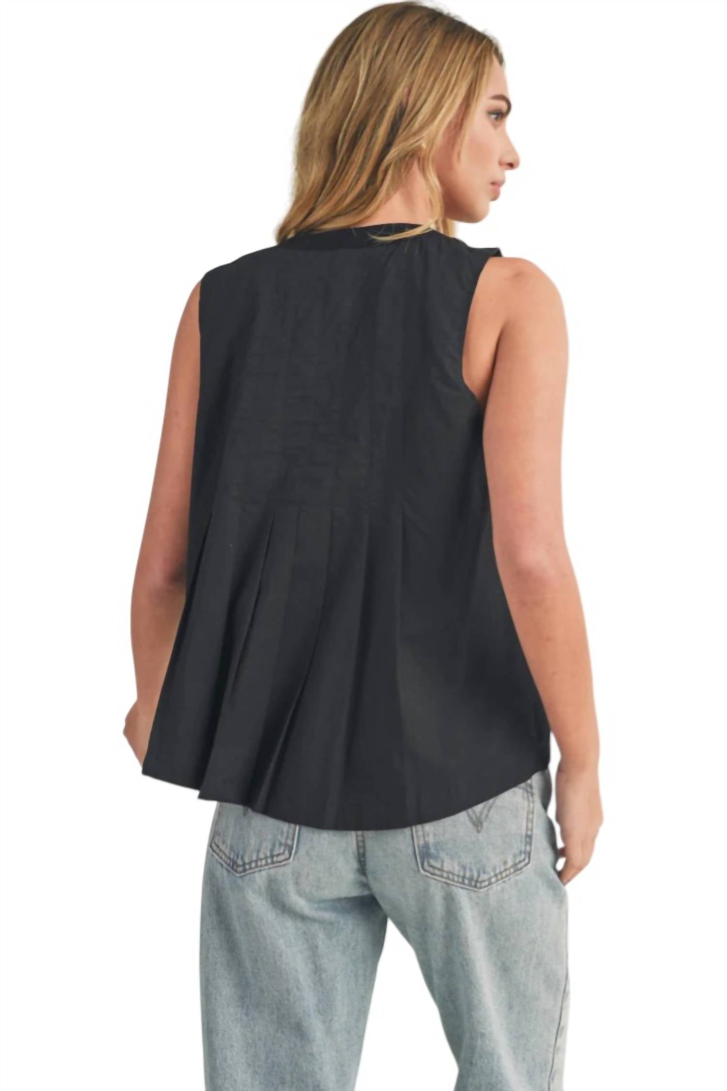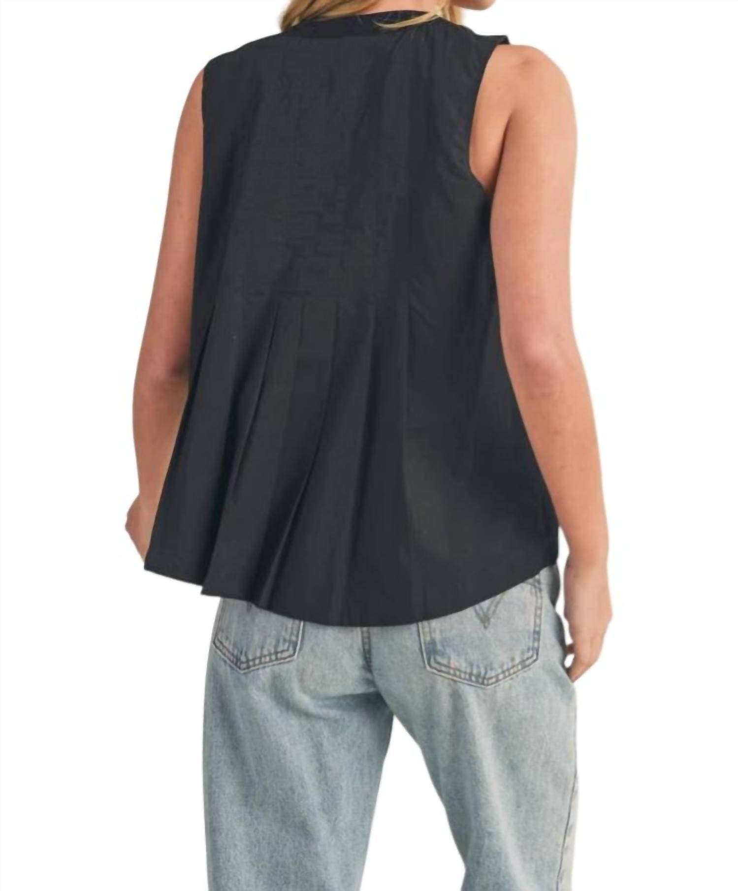 Stylish blend of modern design and everyday comfort. Sleeveless blouse features a ribbed knit V-neckline. Lightweight woven fabric that effortlessly flows into a charming pin tuck and flared pleated hem. Babydoll silhouette top offers a flirty and casual look.