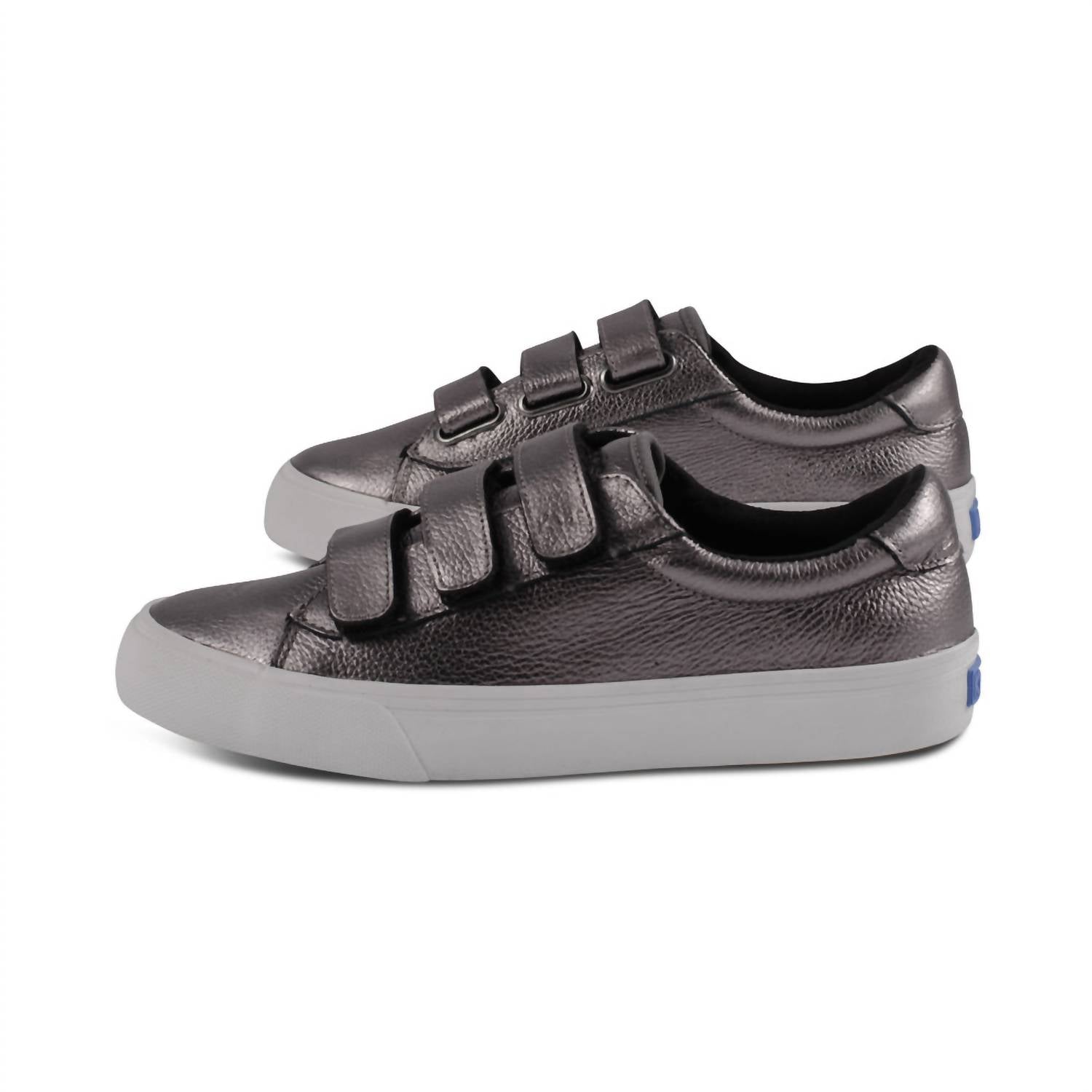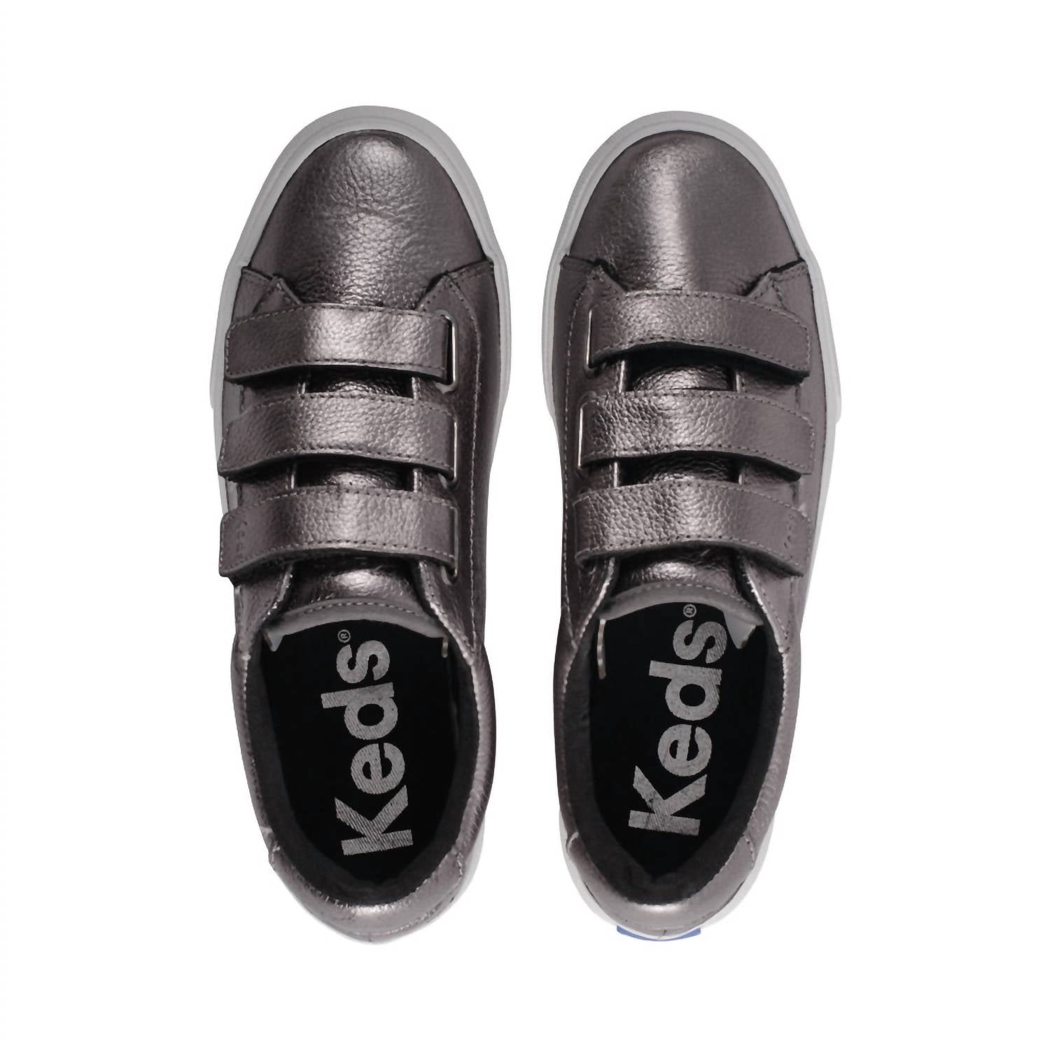 When fashion and function come together seamlessly. Step out in style with the Women's Jump Kick V Sneaker by Keds, perfect for both casual and formal occasions. Expertly crafted with a mix of leather and manmade materials, these sneakers come in a sleek Gunmetal Leather hue. Designed with a round toe and a platform heel, the shoe features a Velcro closure and a 1" sole thickness for added comfort. True to size and equipped with treads for superior traction, these medium-width sneakers offer flat support without compromising on chic appeal.