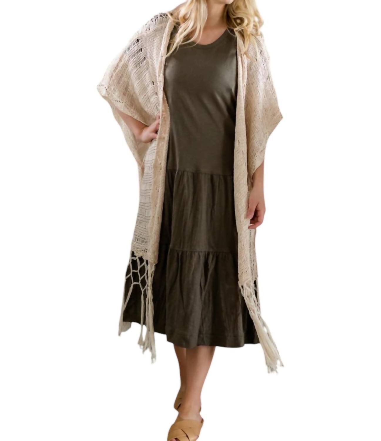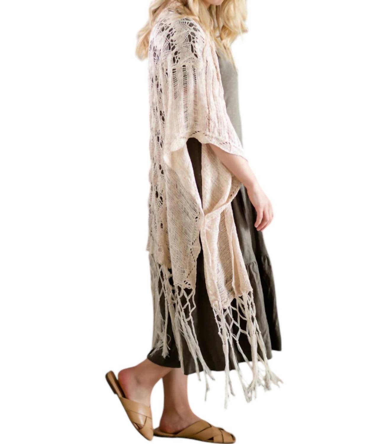 Open-front kimono style. Fringe detailing. Lightweight fabric with intricate crochet patterns.