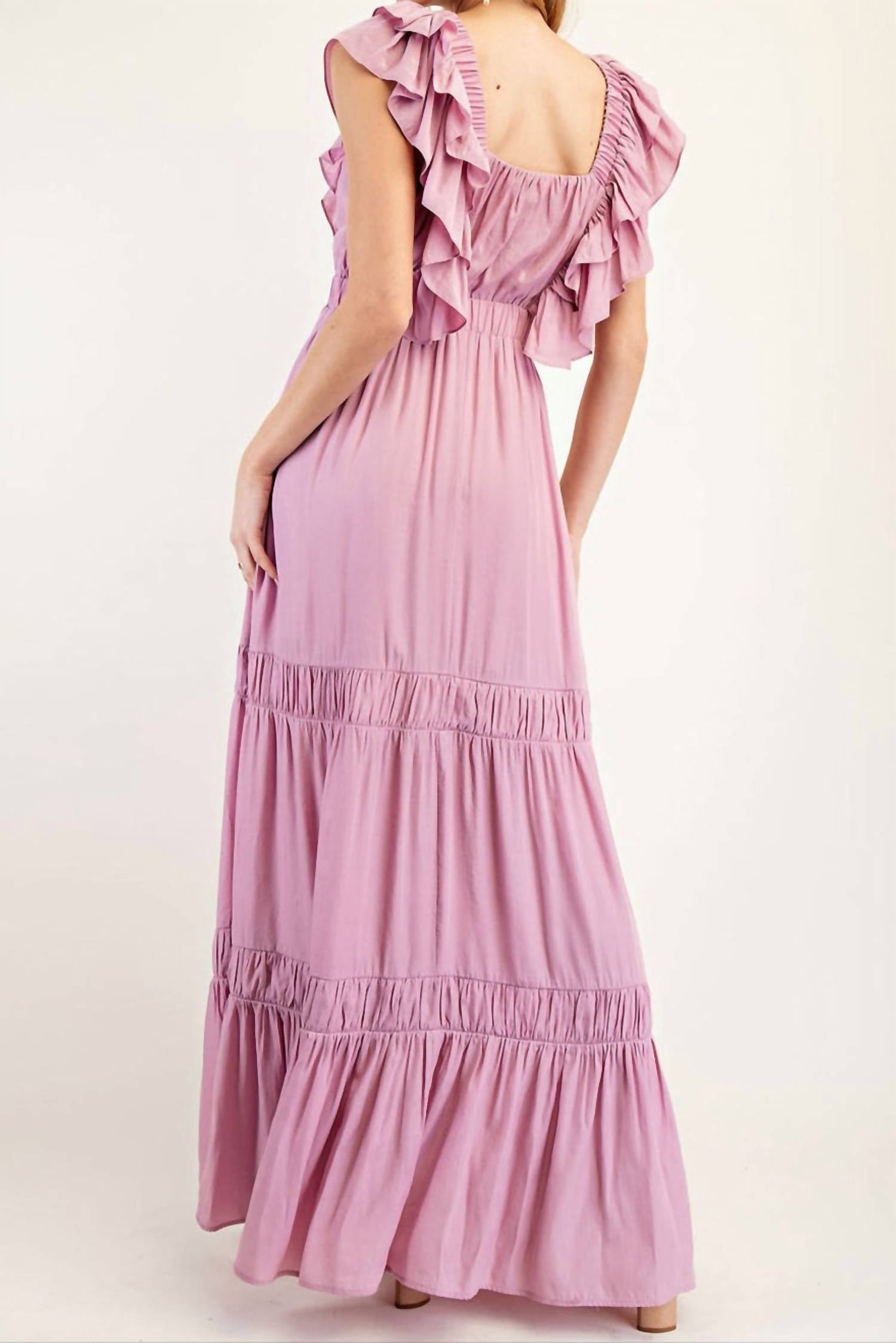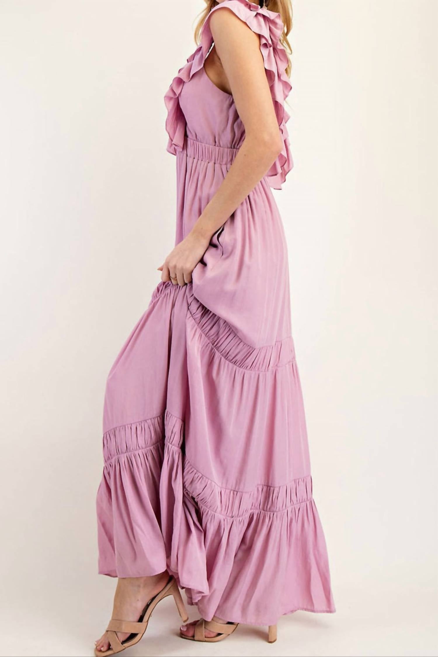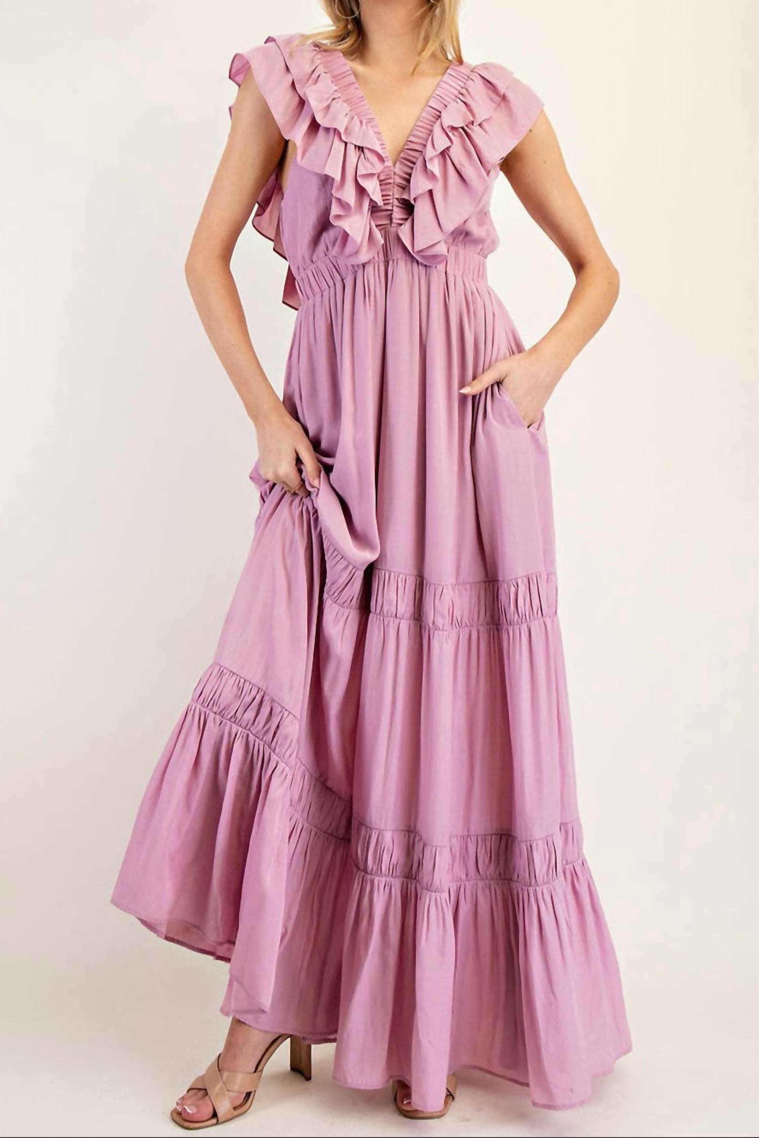 Who doesn't love a good maxi dress? This one you'll be reaching for season after season. Statement piece in lilac perfect for cocktail parties. Sleeveless A-line dress. Crafted from a blend of 60% rayon and 40% polyester. Featuring a flowy, tiered design with a cinched waist and elastic shoulders for a customizable fit. Boasts side pockets and a stylish V-neck with delicate ruffle accents. Pull on closure. Hand wash. Model is 5'8" and wearing a small.