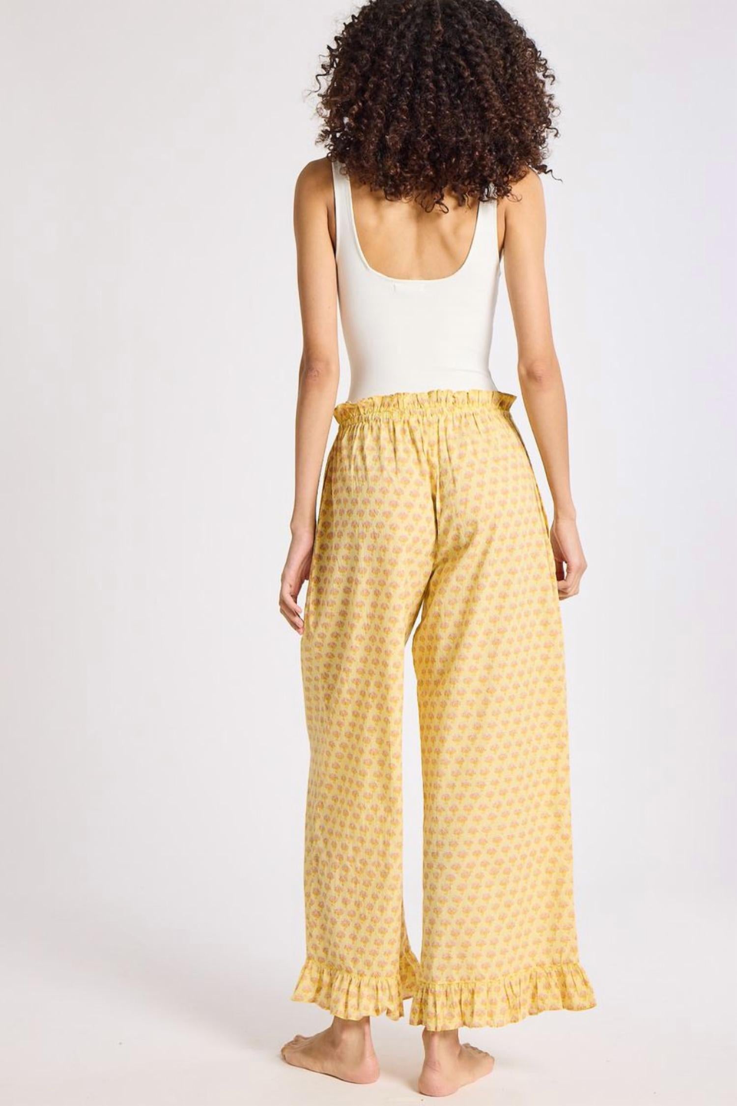 Discover the Addie Wide Leg Pants by MILLE, a boho chic addition in a delightful Buttercup hue. Crafted from 100% Cotton, these pants offer a relaxed fit with a mid-rise waist and a charming paisley pattern. The easy pull-on design features a tie closure, an elastic waistband with a drawstring, and a button-up fly, enhanced by functional pockets and a ruffled hem. Perfect for vacations or Easter gatherings, care is simple with machine wash instructions.