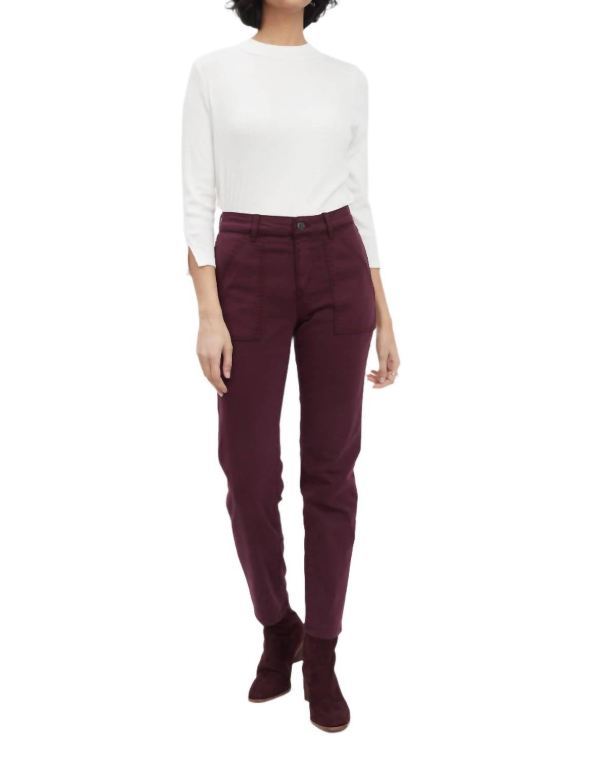 This classic straight leg jean has a perfect fit and goes with just about everything. Step into style with the FDJ Olivia Slim Straight Jeans in a striking merlot hue, meticulously crafted for both flattering fit and comfort. Boasting a slim straight leg and a high-rise waist, these jeans come with a button closure and front patch pockets for added convenience. Comprised of an 89% Cotton, 10% Polyester, and 1% Elastane blend, they promise durability and a comfortable stretch. Perfect for any casual outing, these jeans are a standout addition to any spring streetwear collection.