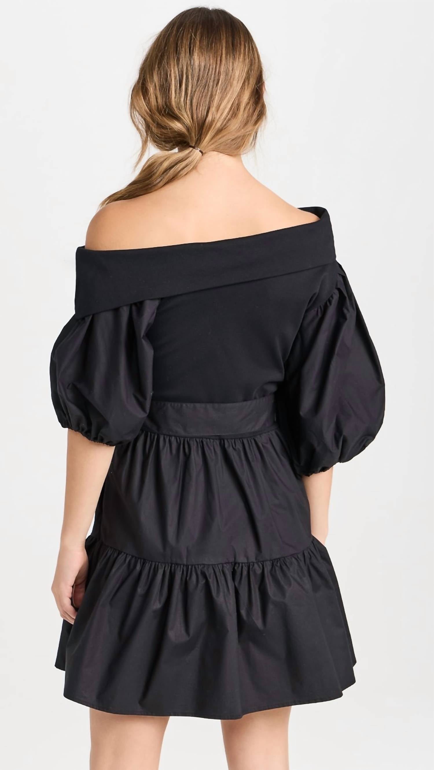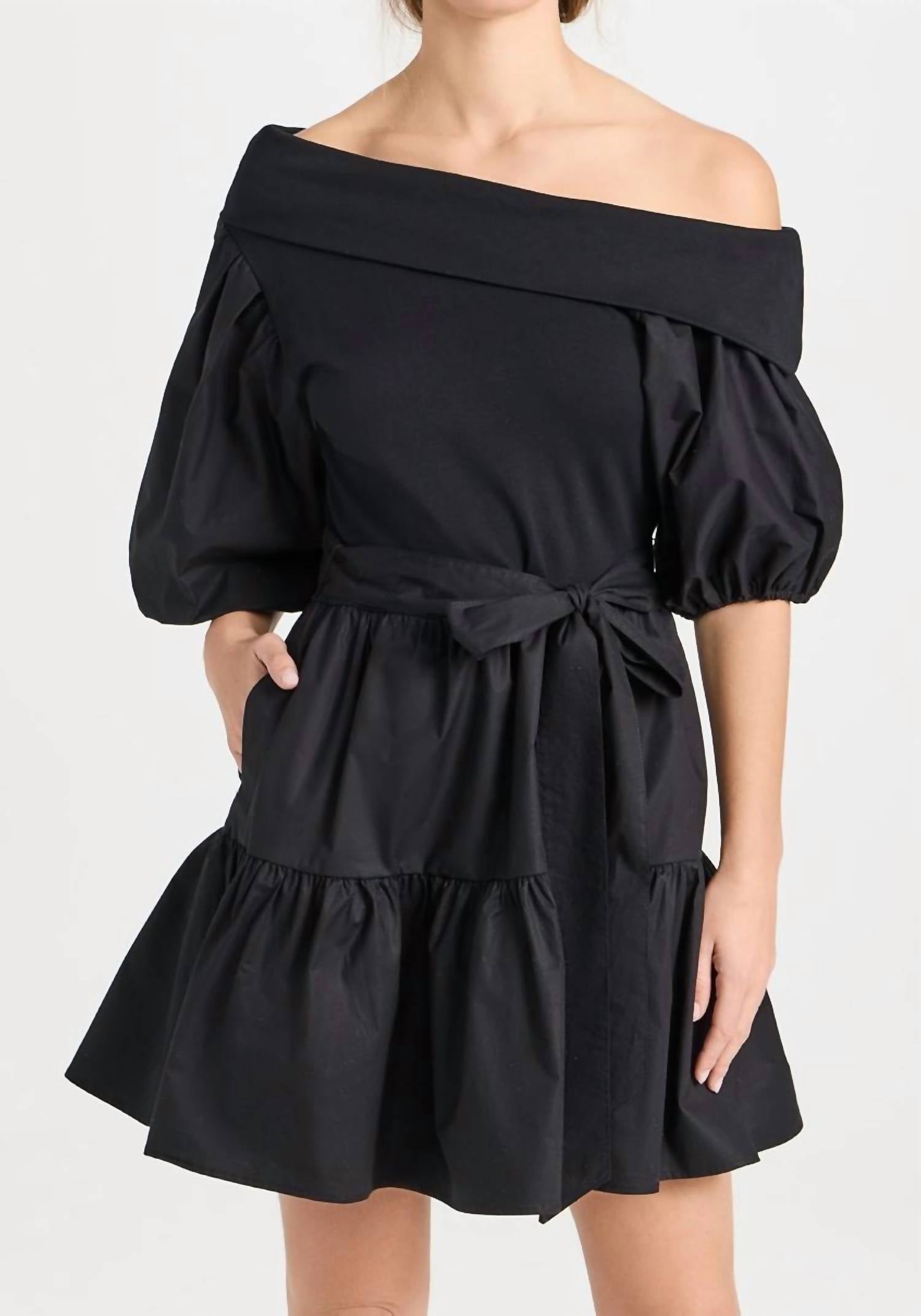 This Short Georgia Dress features an off-the-shoulder design with puff sleeves, a tiered skirt, and a self-tie belt for a flattering silhouette. Crafted from 100% cotton with a jersey bodice, it includes a hidden side zip and pockets for added convenience.