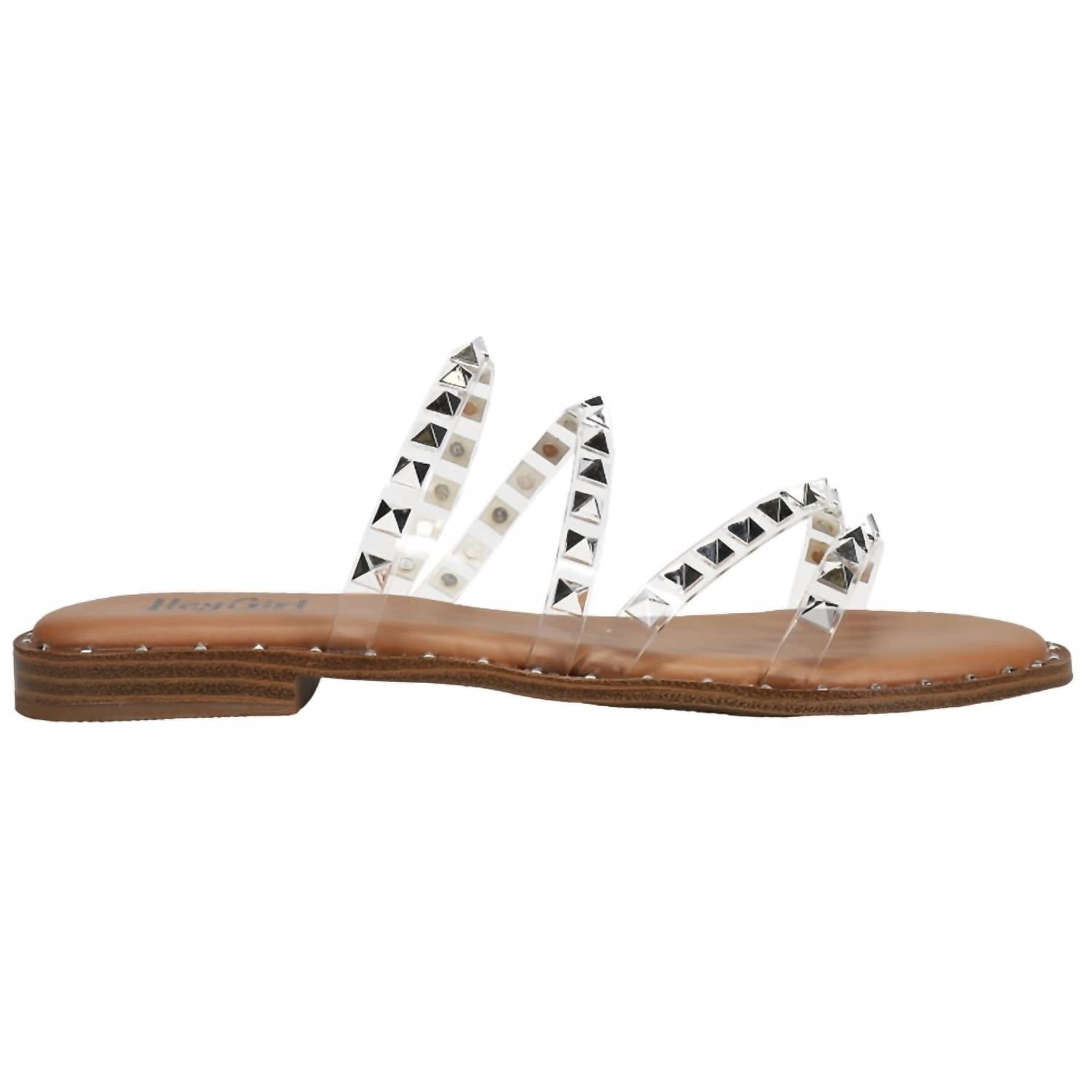 This sandal will take you from brunch to dinner and everything in between. Introducing the Women's Beach Please Sandal by Corkys Footwear, a stunning choice for your summer wardrobe. The clear faux leather upper features striking pyramid stud accents on the top straps, complemented by additional tiny studs edging the foot bed. Designed with a lightly padded foot bed for comfort, this sandal includes a .75 inch heel and .25 inch platform, ideal for all-day wear. Made from man-made materials with a flat heel style and a classic round toe shape.