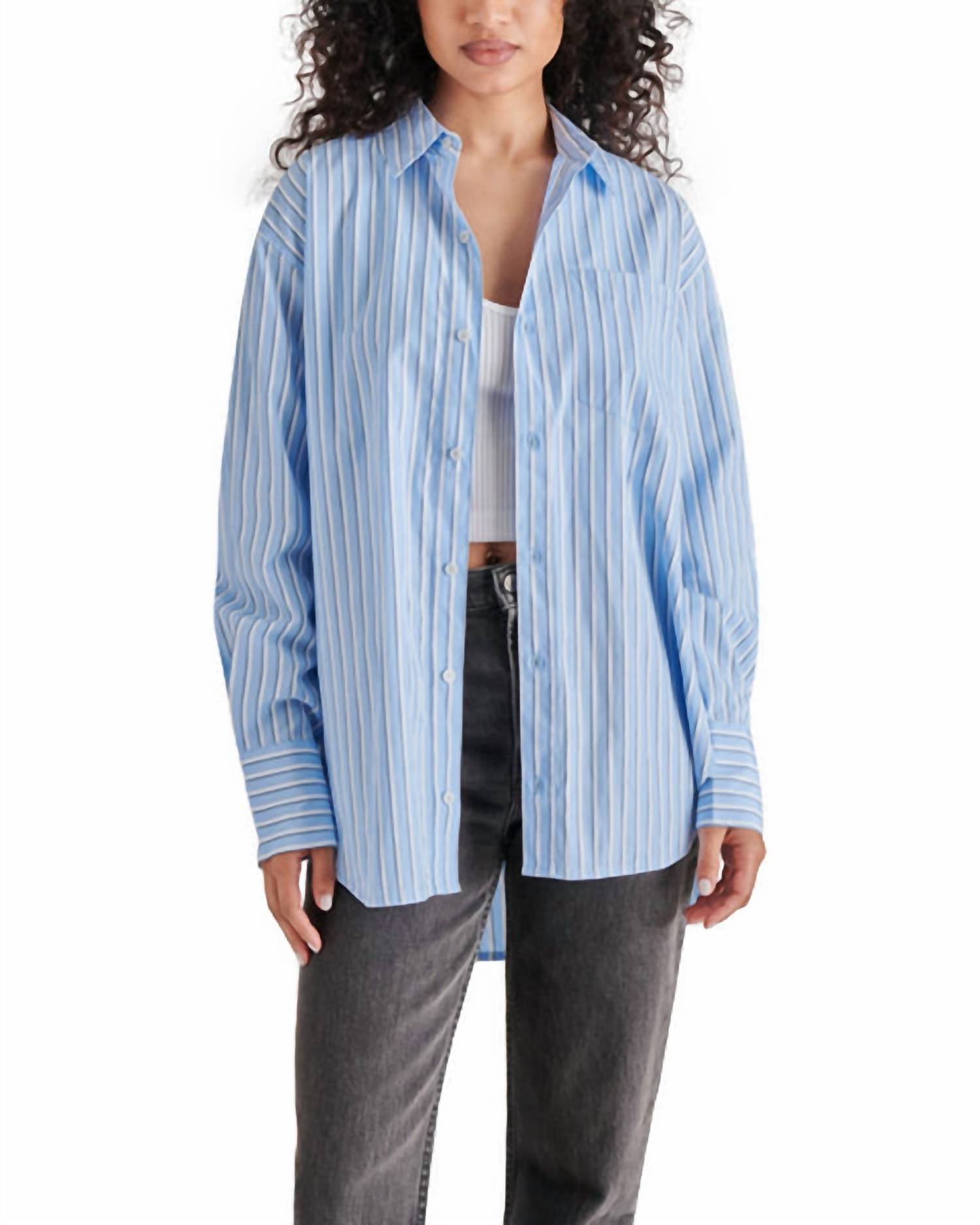 Crafted in classic poplin with pinstripe details, this button down. Oversized fit. Model is wearing small. Machine wash cold. 60% Polyester, 40% Cotton.