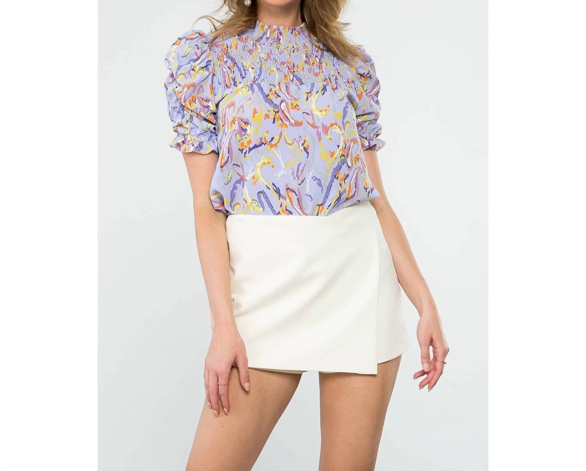 A timeless blouse that will never go out of style. The Ruched Sleeve Smocked Print Top by THML is a fashionable women's blouse perfect for any dinner party or New Year's Eve celebration. Featuring a mockneck and short sleeves, this purple patterned top is crafted from 100% polyester in a woven design. The zip closure ensures a snug fit while highlighting its trendy 90s fashion influence. Care instructions recommend machine wash for easy maintenance. Model is wearing size S (5'9" height, 32" bust, 25.5" waist, 36" hips).