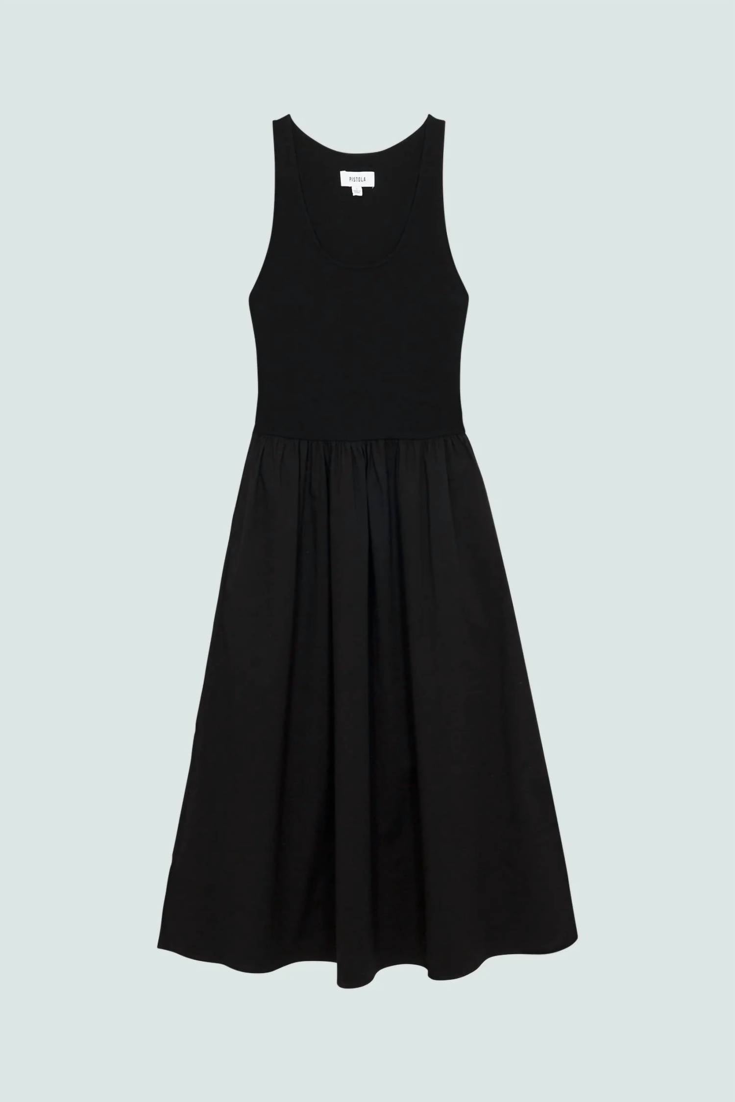 Just add slides or mules and you are good to go. Elevate your wardrobe with the Faye Midi Dress by PISTOLA, designed for versatility and comfort. This black midi dress features a sleeveless design with a scoopneck and an A-line silhouette, perfect for summer and spring events. Crafted from a blend of 77% viscose and 23% nylon, this dress offers a soft feel and easy pull-on closure. Care for it effortlessly with machine wash instructions, making it a staple for minimalist holiday parties and Thanksgiving gatherings.