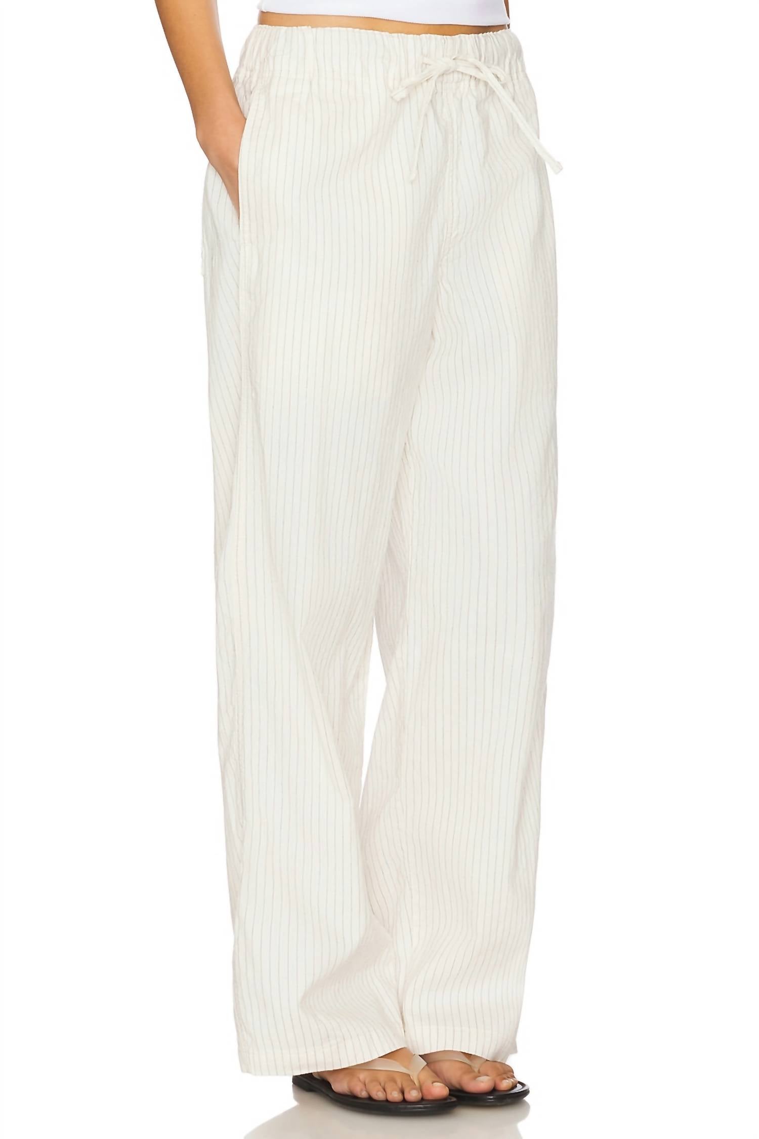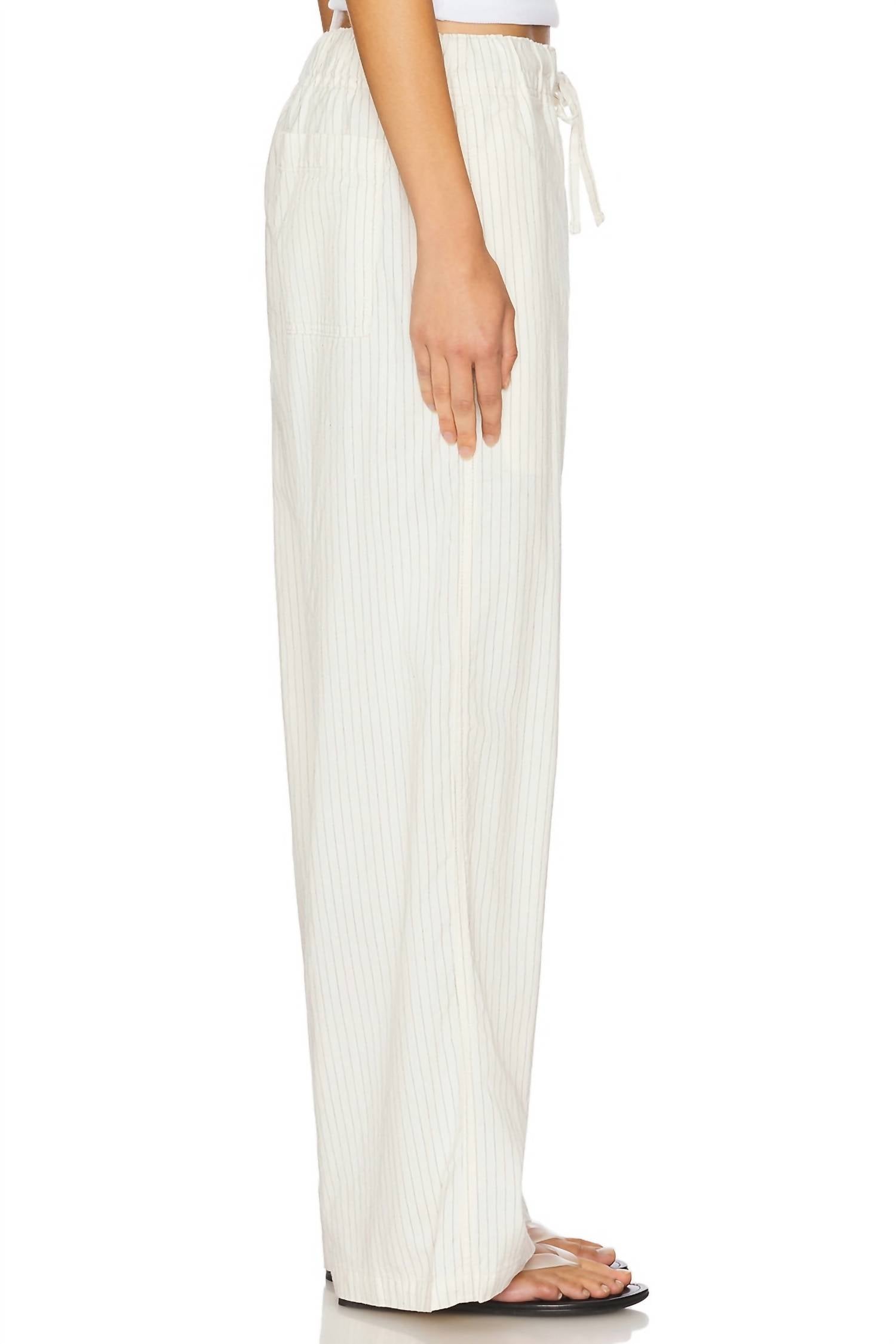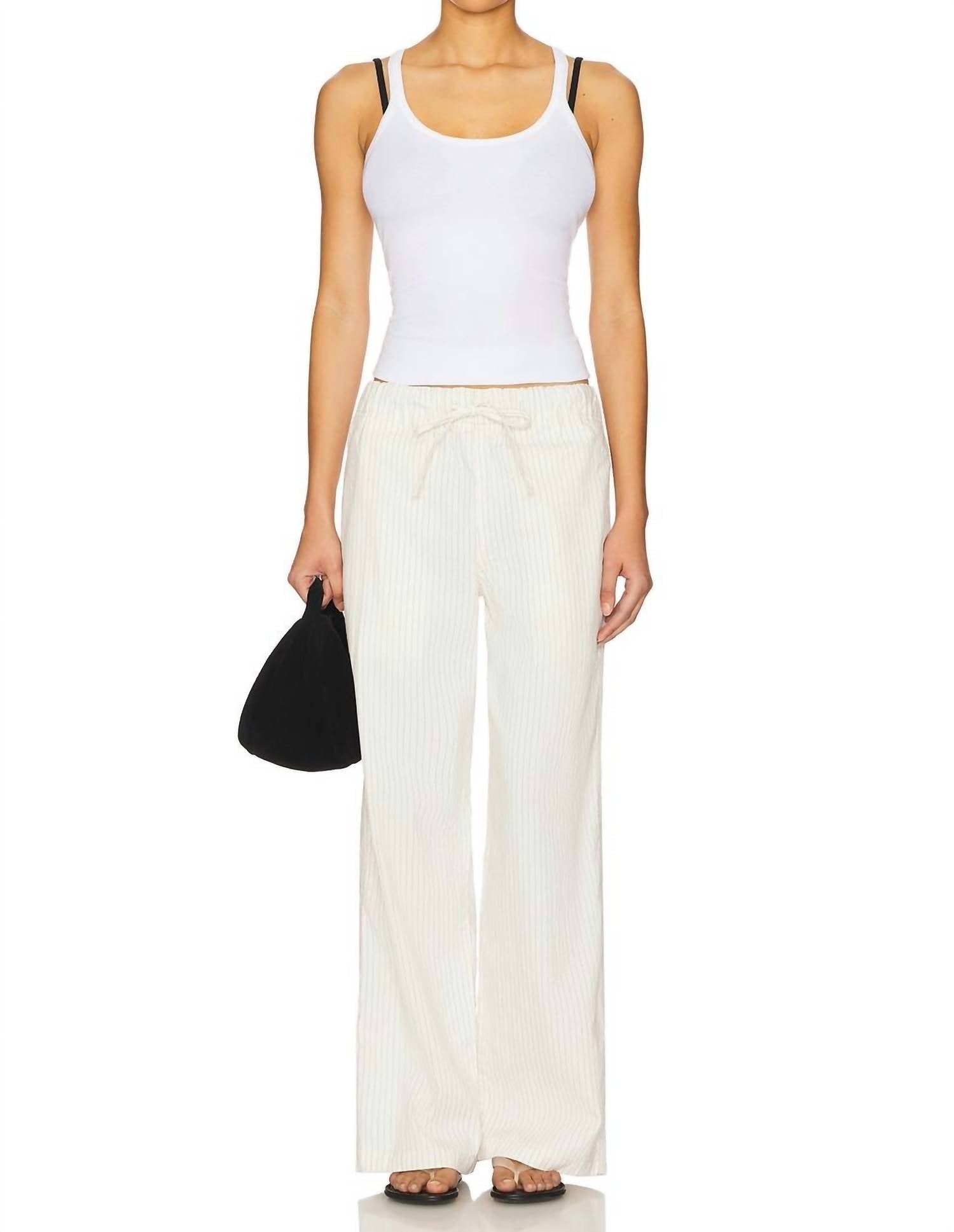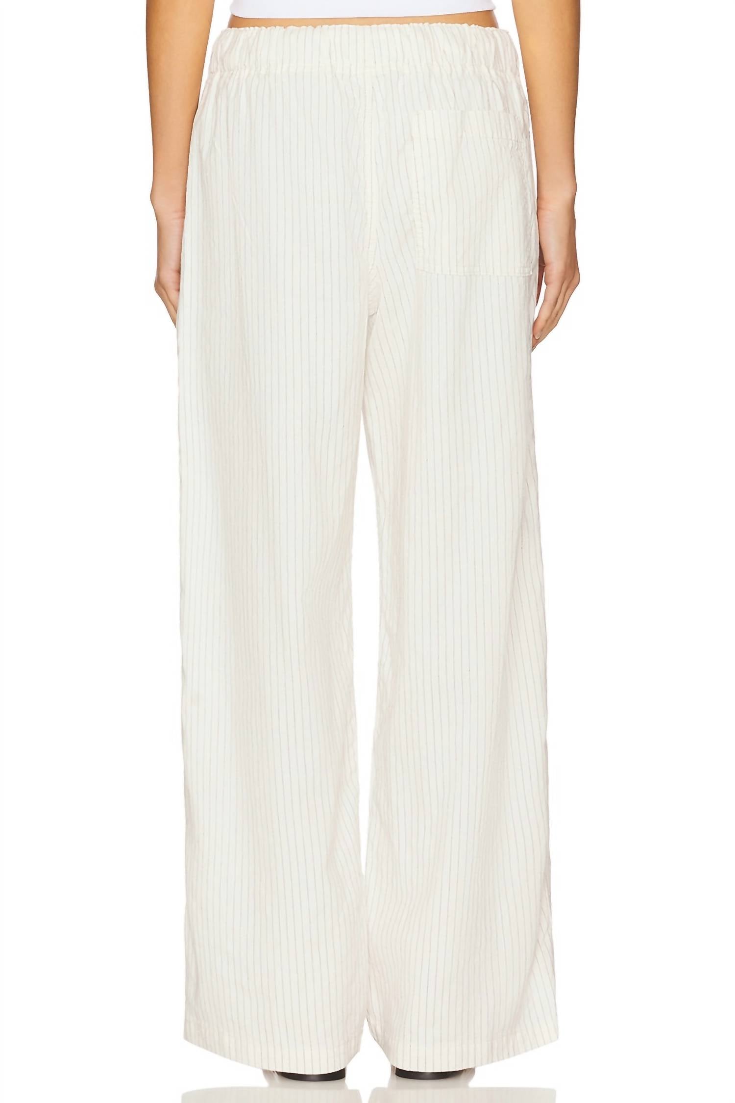 Discover the AMO Janis Pant in Bone Stripe, where comfort meets style with a wide-leg silhouette and relaxed fit. These pants are crafted from 100% cotton material, showcasing a chic herringbone weave contrasted by elegant pinstripes. Enjoy the convenience of a pull-on closure with a drawstring waist for an effortless look, made in the USA. Easy to care for, these pants are machine washable on cold and can be tumble dried, featuring a high-rise front rise of 11.75 inches and an inseam of 30 inches.