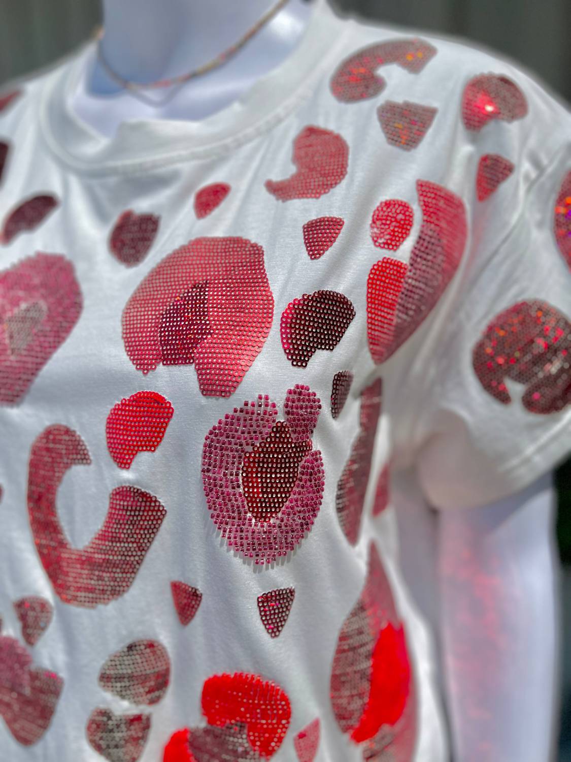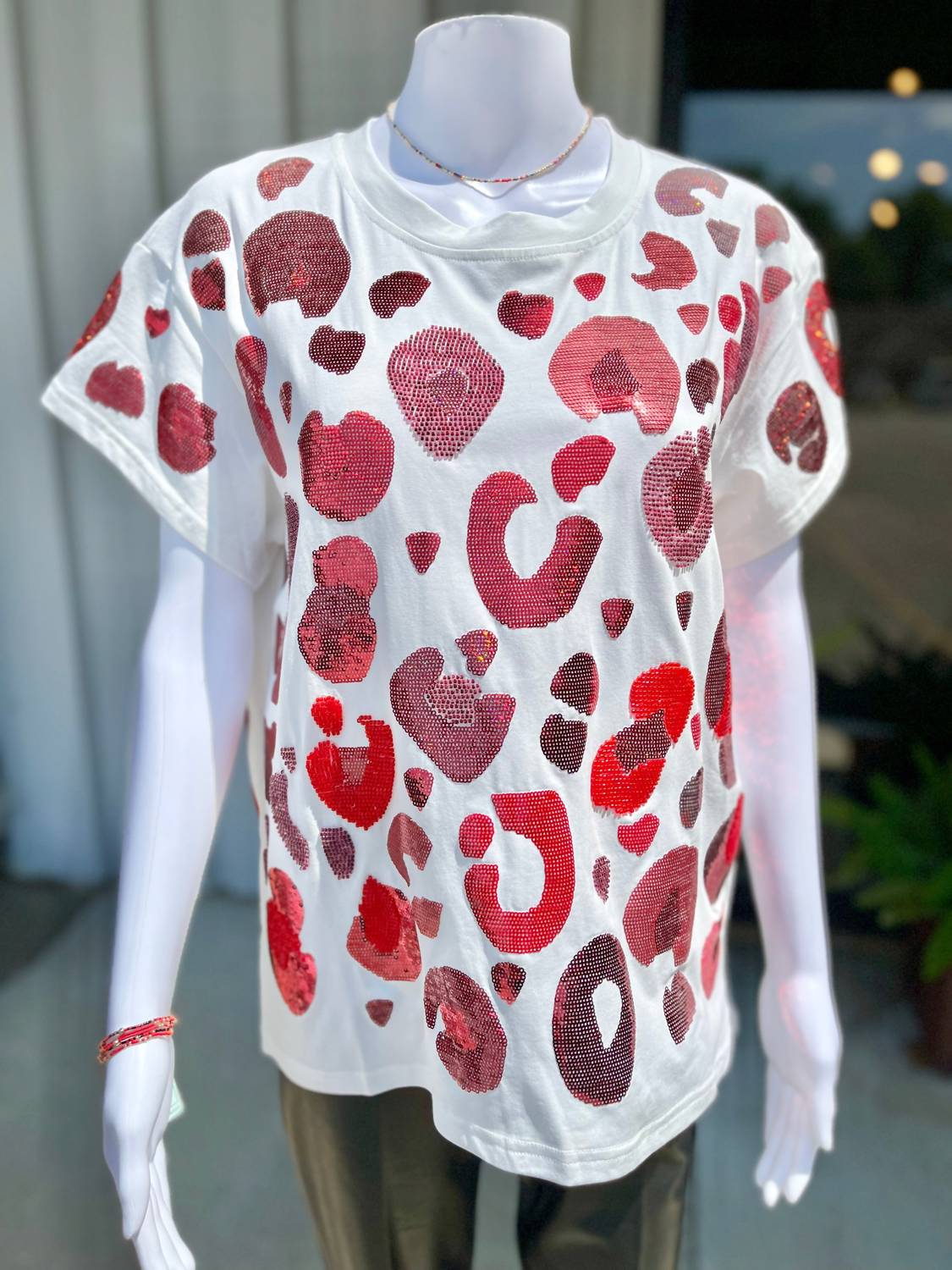 Look no further, you just found your perfect tee! Unleash your bold style with the Women's Leopard Top by Queen of Sparkles, a striking choice for any wardrobe. This short sleeve tee, accented with a sequin leopard design, promises to make a statement in its vibrant crimson and white. Featuring a classic crewneck and a convenient pull-on closure, it's ideal for springtime vacations and maximalist trends. With an animal pattern that's hard to ignore, this no-fuss piece brings a playful edge to your collection.