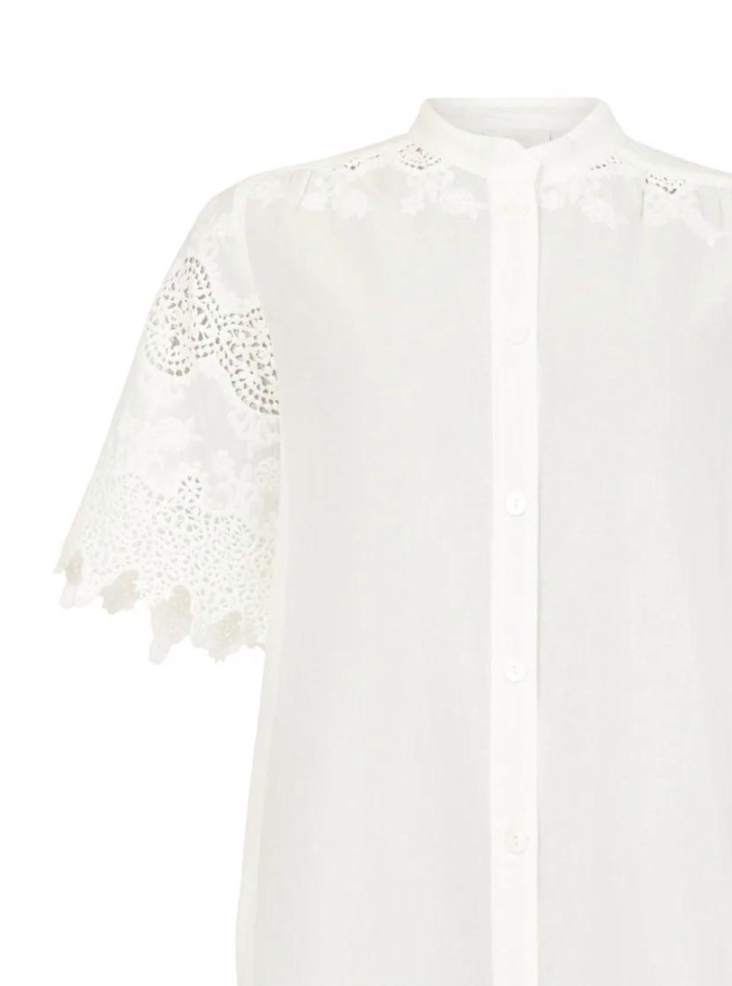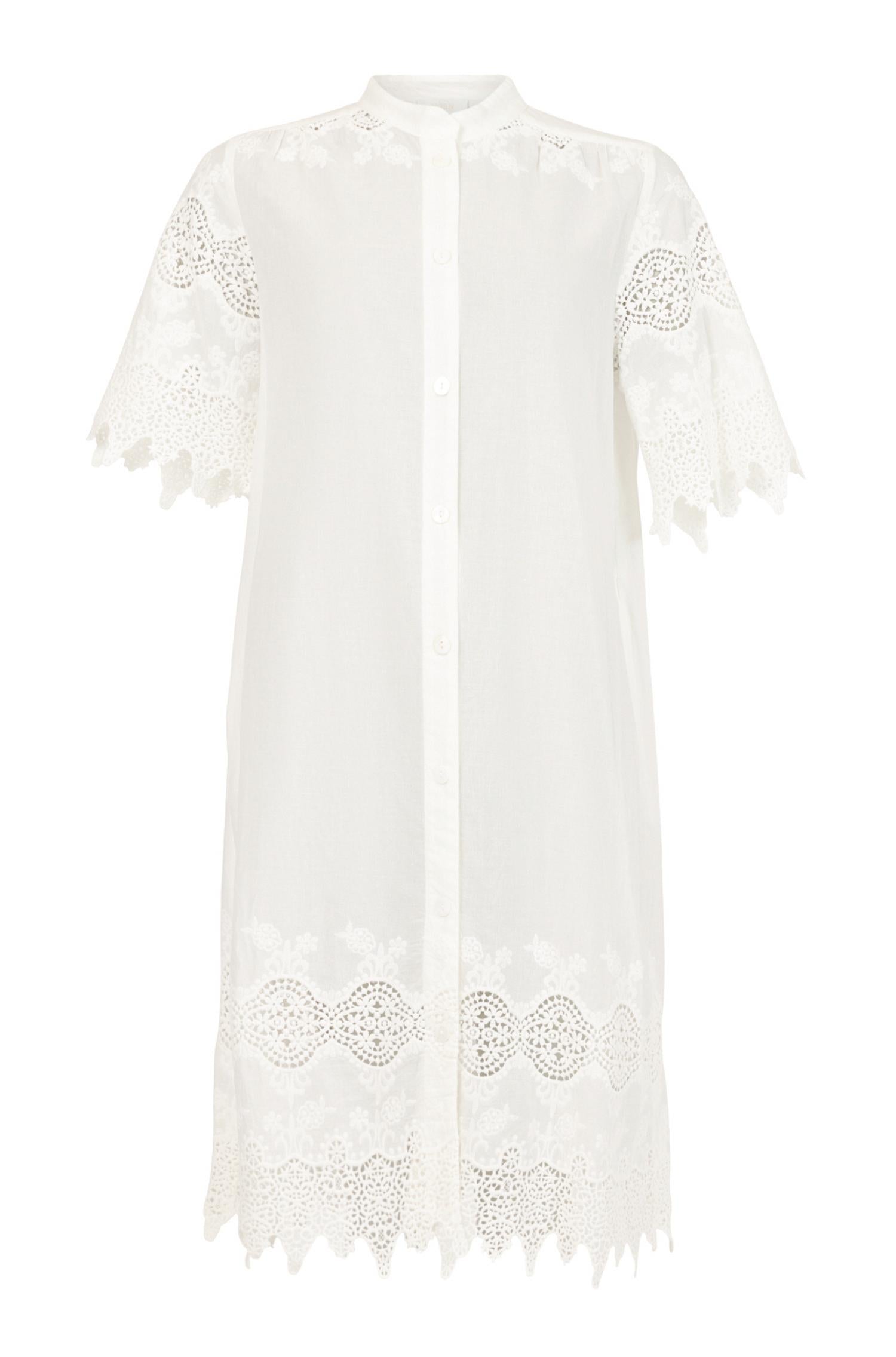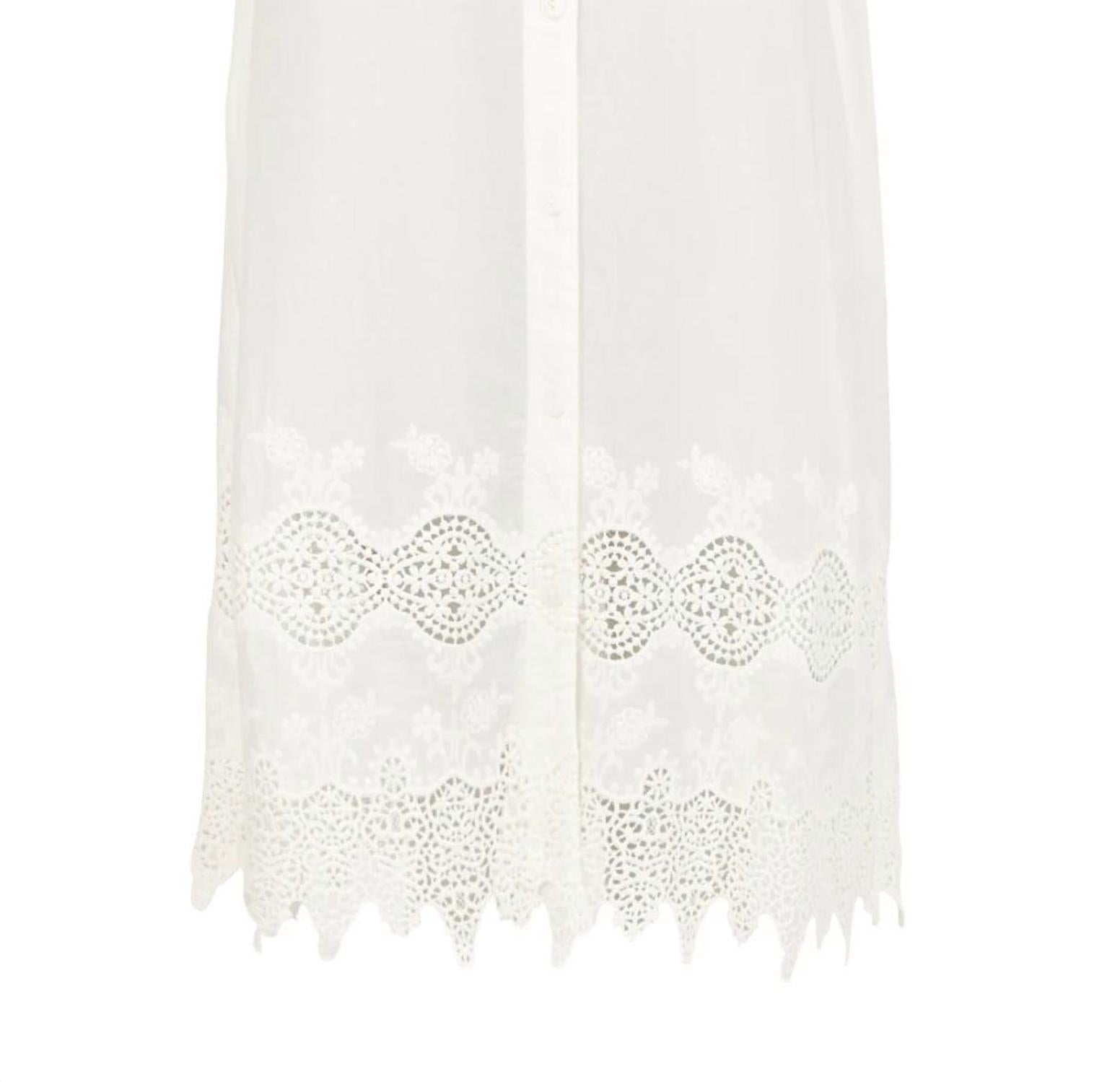 A short and breezy dress for those warmer days. Experience the effortless style of the Women's Laced Shirtdress by NOEN, a perfect addition for spring and summer wardrobes. This crisp white mini dress features short sleeves adorned with delicate lace trim and eyelet embroidery details for a feminine touch. Designed with a relaxed, straight shift silhouette and a button-down front with a mockneck, it offers a lightweight, breathable fabric ideal for boho chic occasions and vacations. Care instructions recommend dry cleaning to maintain its pristine look.