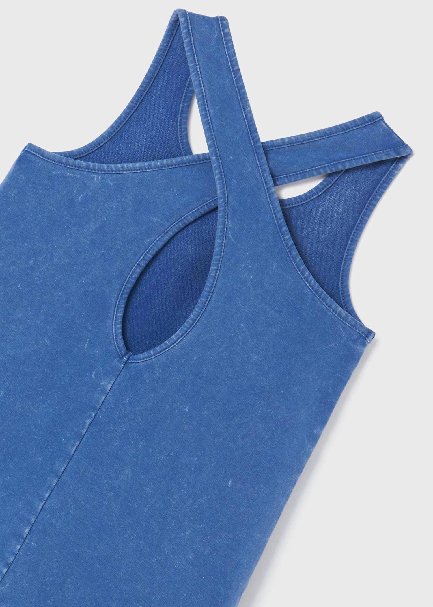 The Girl's Keyhole Sleeveless Dress by Mayoral is a chic choice in a washed indigo hue, perfect for quick and stylish wear. Made entirely from 100% Cotton, this dress features a sleeveless design with wide straps and a fashionable oversized keyhole cutout at the back. Its relaxed drop waist silhouette and pull-on style offer comfort and flair, ending just above the knee. Care for this dress with a machine wash in cold water, avoid bleach, and line dry, with cool ironing if needed.