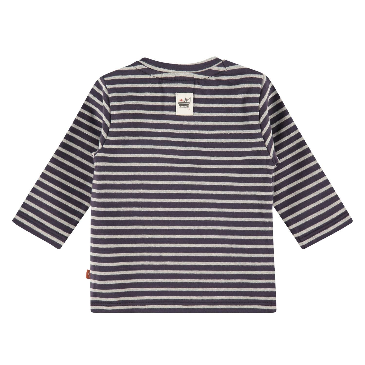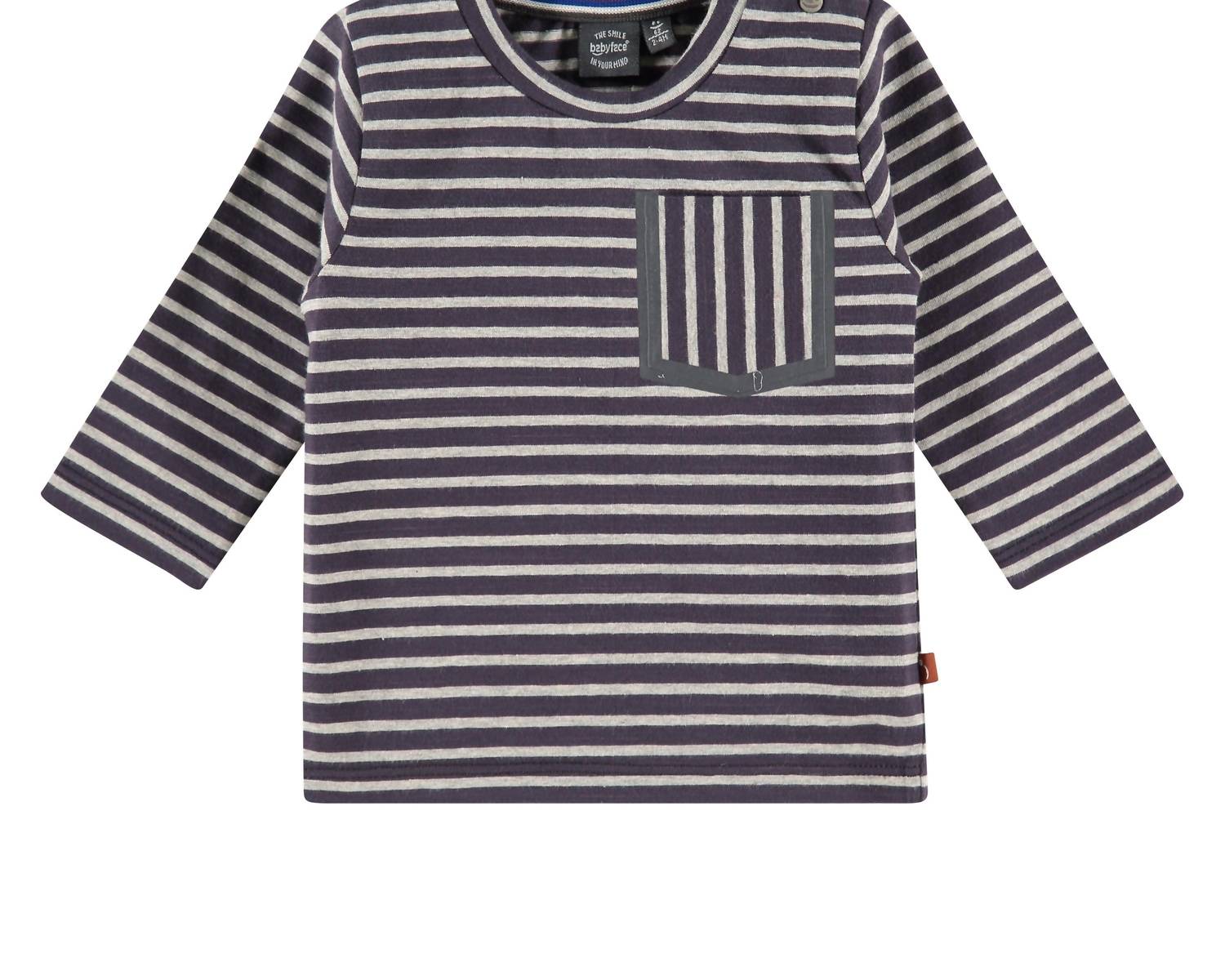 Presenting the Boys' Striped Pocket Tee by Babyface, a stylish choice for your little one's wardrobe. This dark blue top features full-length sleeves, a classic crewneck, and a double snap button closure on the right shoulder for a fun twist. Crafted from a cotton blend of 83% Cotton, 12% Polyester, and 5% Elastane, it's both lightweight and breathable, ideal for standalone wear or layering. Care for this piece is simple: machine wash cold separately, lay flat to dry, and cool iron inside out.