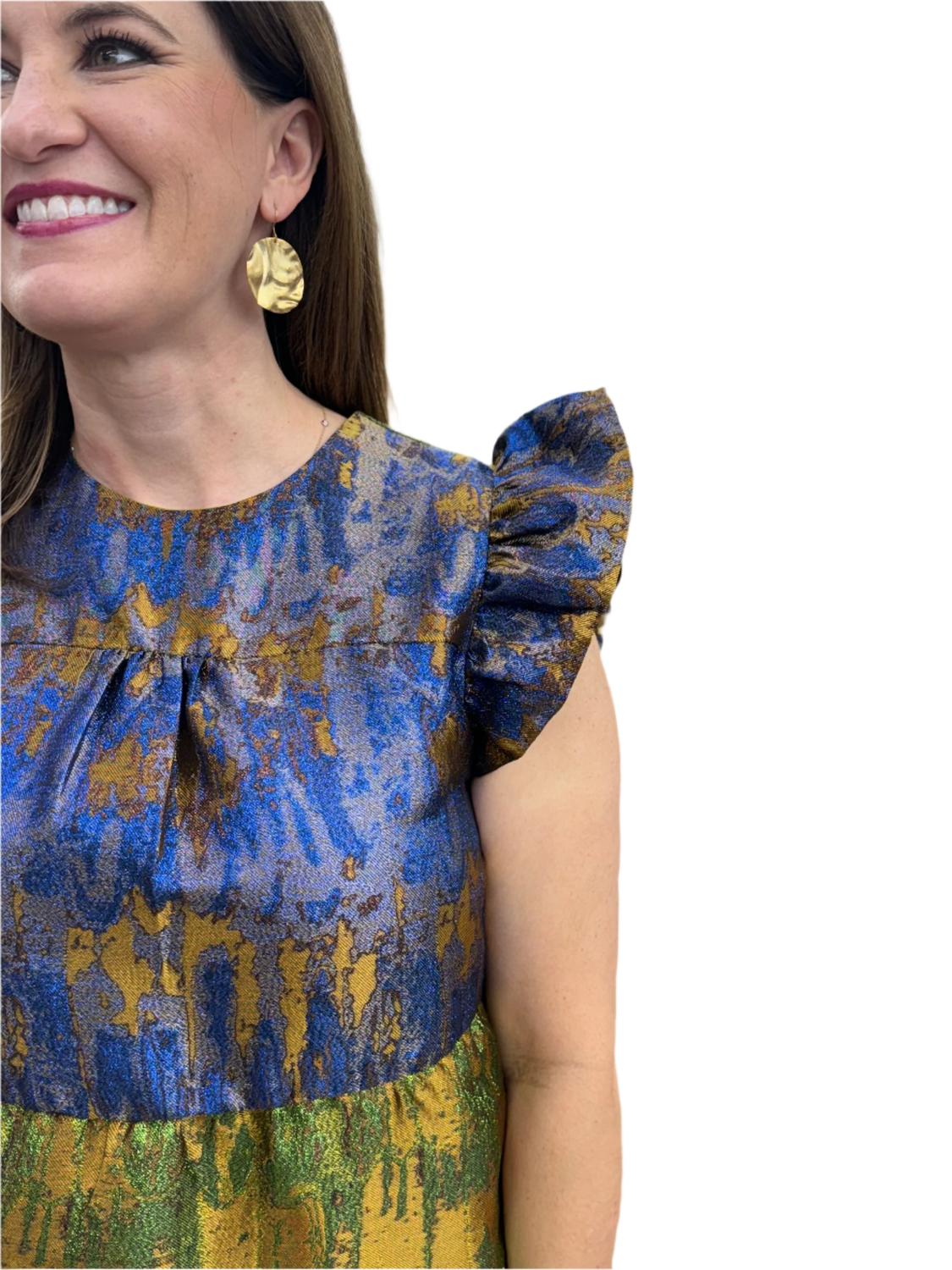Introducing the Flutter Sleeve Dress by THML, a stunning mini dress perfect for your next date night. This sleeveless dress comes in a dazzling metallic blue and features a playful A-line silhouette, enhanced by a crewneck and flutter sleeves. Closure is a convenient pull-on style, making it easy to wear, while care instructions include a hand wash and laying flat to dry. Size small measurements: length 34.5 inches, bust 37 inches. Model's stats: 5'9" height, 32" bust, 36" hips.