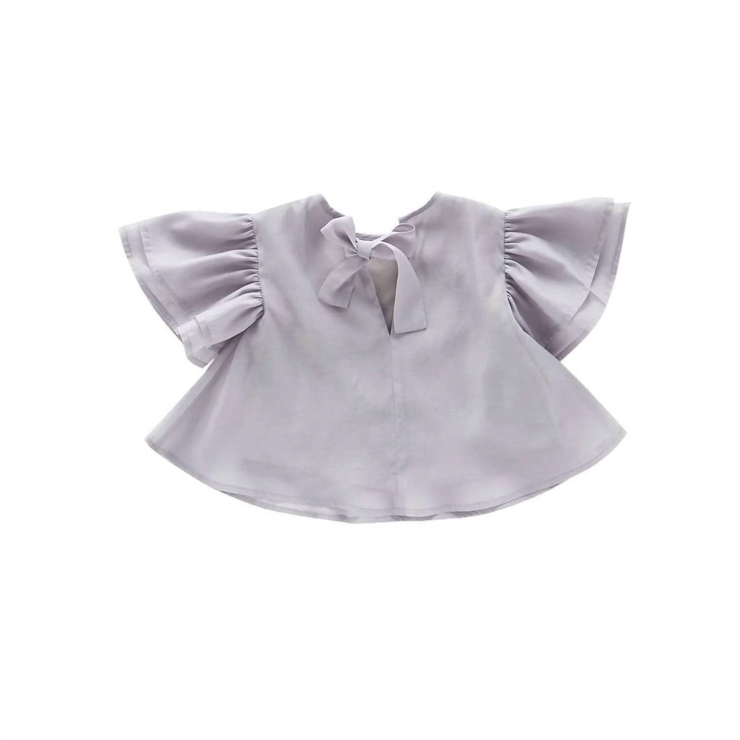 Keyhole opening back with bow ties. Elbow length flutter sleeve. A-line shape. Round neckline. Fully lined. 100% polyester with 100% cotton lining.