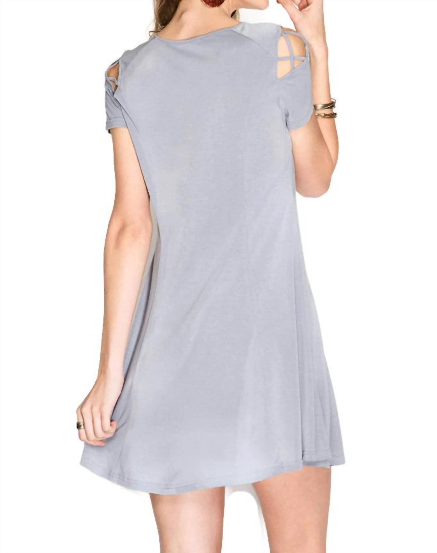 This dress features short sleeves, a V-neck with criss cross straps, shoulder cutouts with criss cross straps, princess seams, a very soft stretchy fabric & a mini swing silhouette. Small Bust 32" Length 32; Medium Bust 34" Length 32"; Large Bust 36" Length 32". 55% Cotton, 45% modal. Hand wash cold. Imported.