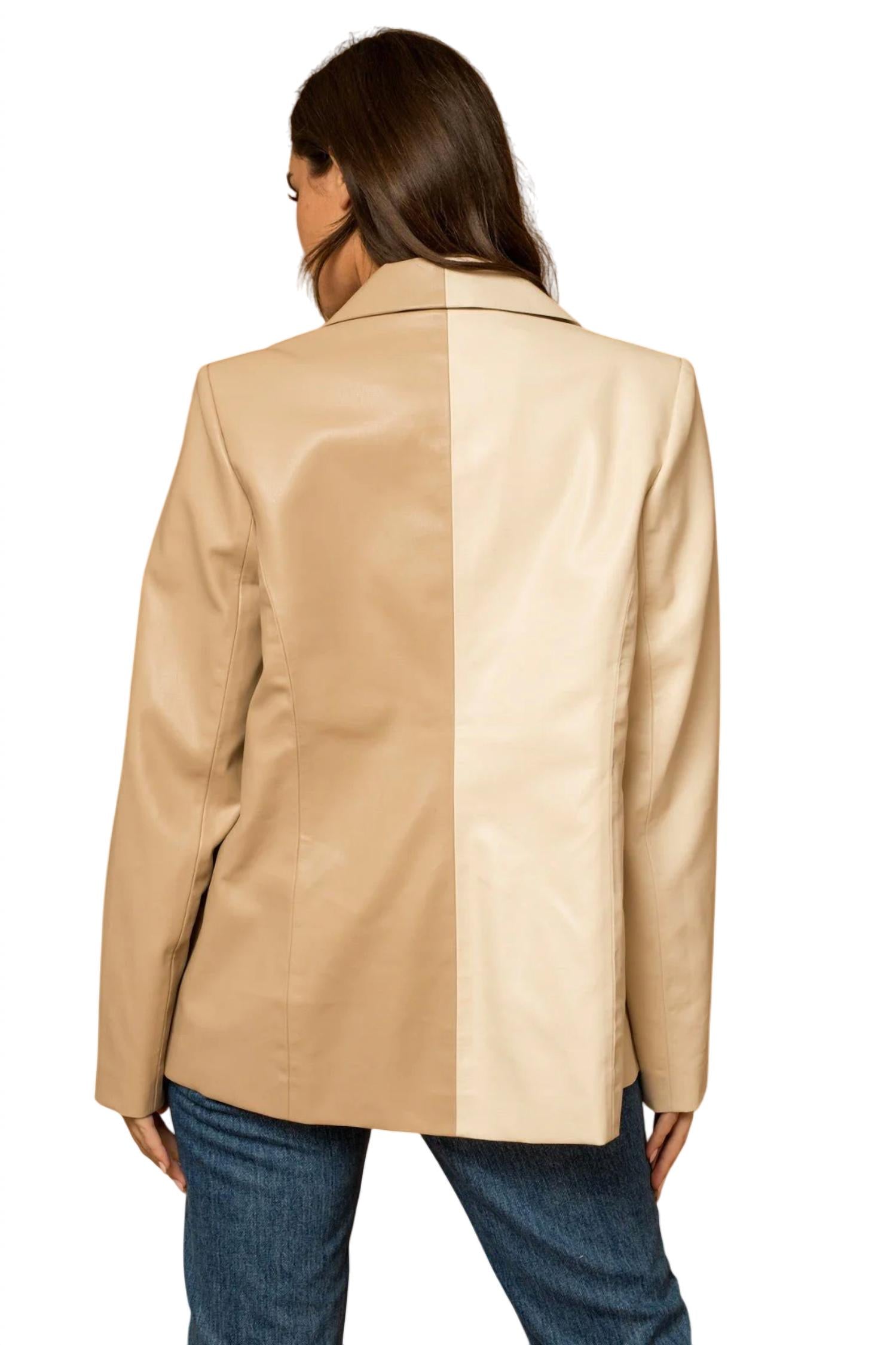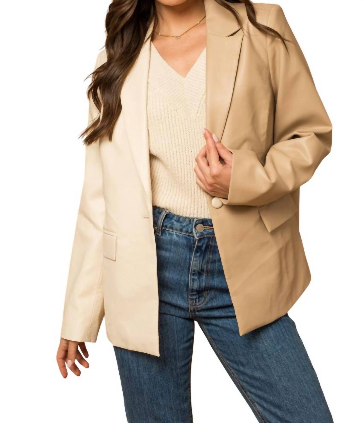 Stay chic and cozy with the Bobbi Colorblock Faux Leather Blazer by GILLI, a stylish addition in enchanting Off White and Taupe Moon hues. This blazer features long sleeves and is crafted from 50% polyurethane and 50% cotton, ensuring a blend of both comfort and elegance. With a sleek button closure and a classic collar neckline, it’s perfect for any occasion. Practical pockets add functionality to this striking piece.