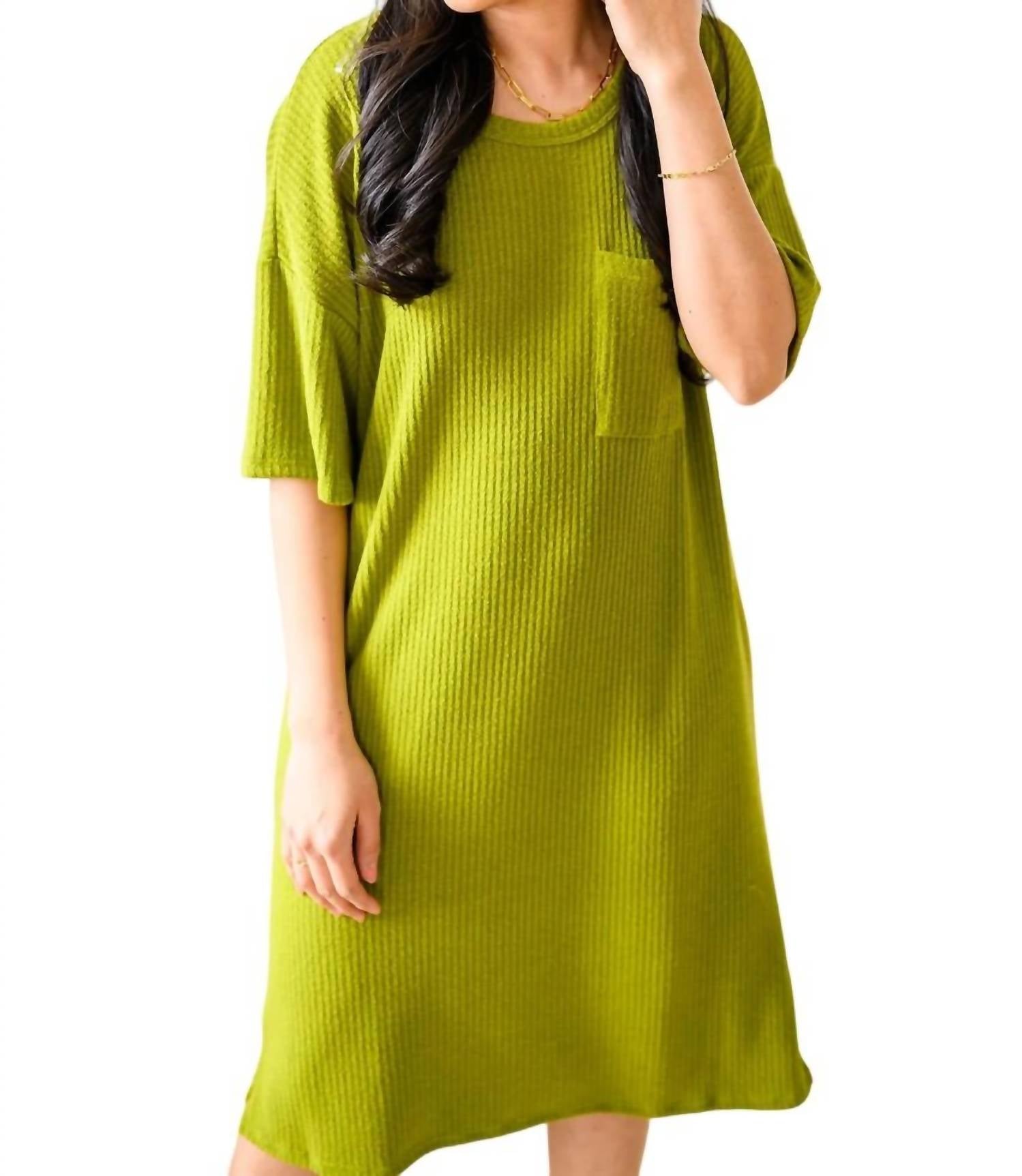 Ribbed Sweater Knit. Patch Pocket. Midi Length. Relaxed Shift Silhouette. 65% Polyester, 30% Rayon, 5% Spandex. True to Size.