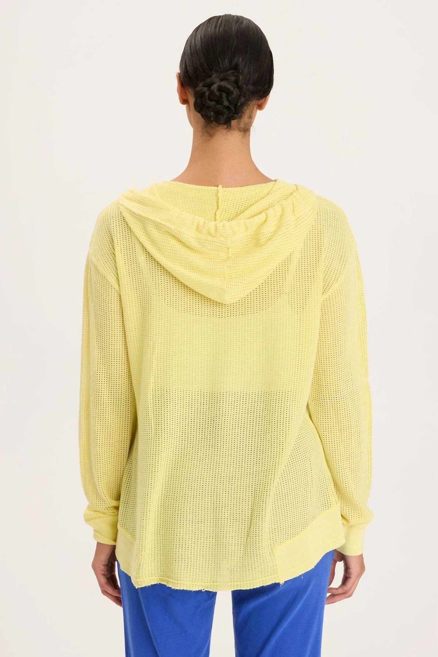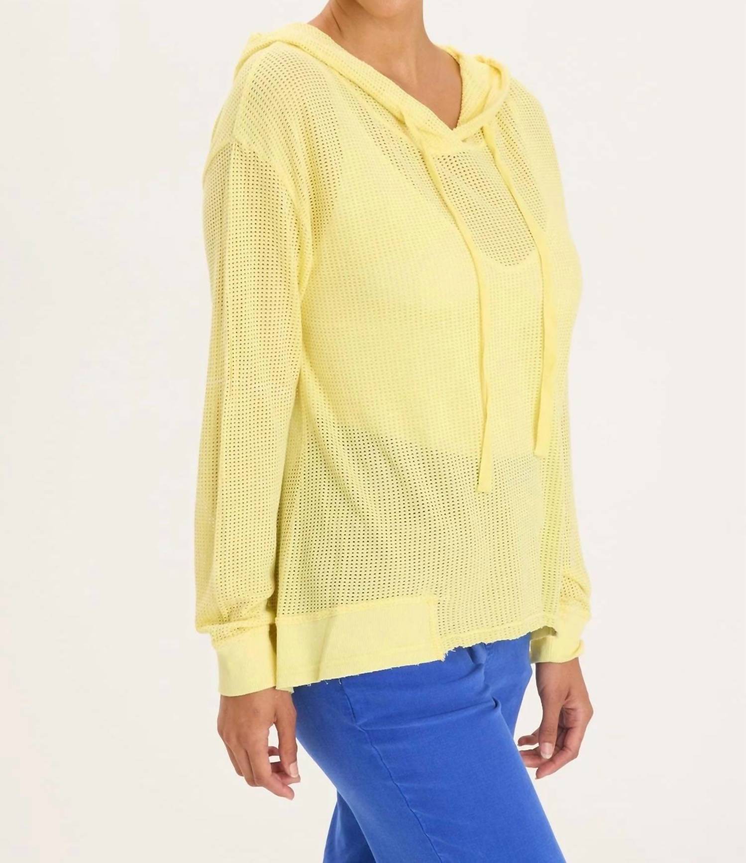 Whether you're running around town or lounging at home, this sweatshirt works for both. Elevate your lounge game with the Sidel Hoodie by XCVI, crafted in a stylish mesh design. This long sleeve hoodie features a composition of 52% Cotton and 48% Tencel, ensuring a comfortable and relaxed fit. Its rib trims blend 95% Cotton and 5% Spandex, measuring approximately 18.25" at the front and 24.5" at the back. With a pull-on closure, it's machine washable, imported, and comes in a delightful light butter yellow Illume color.