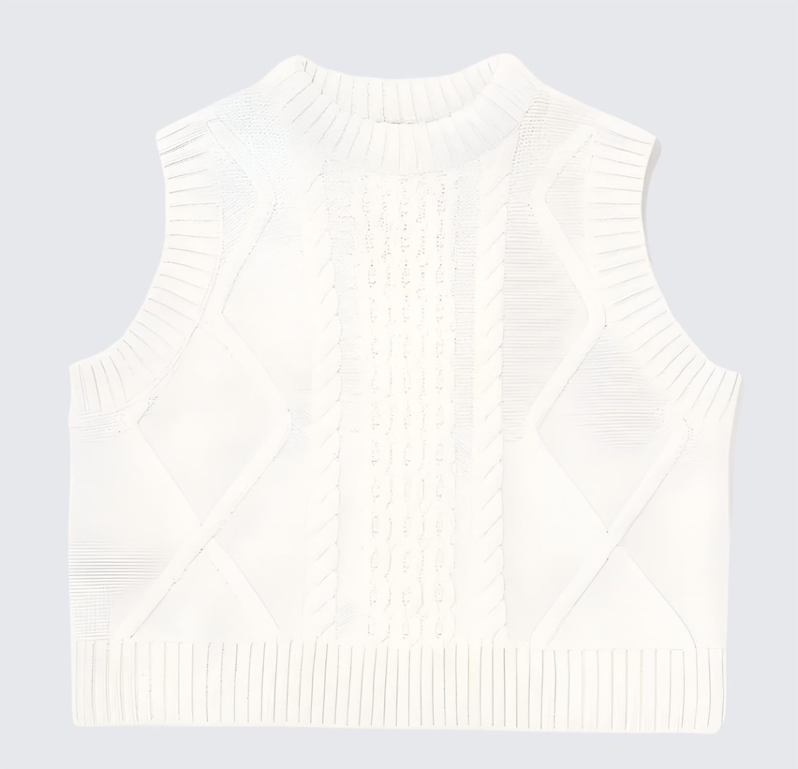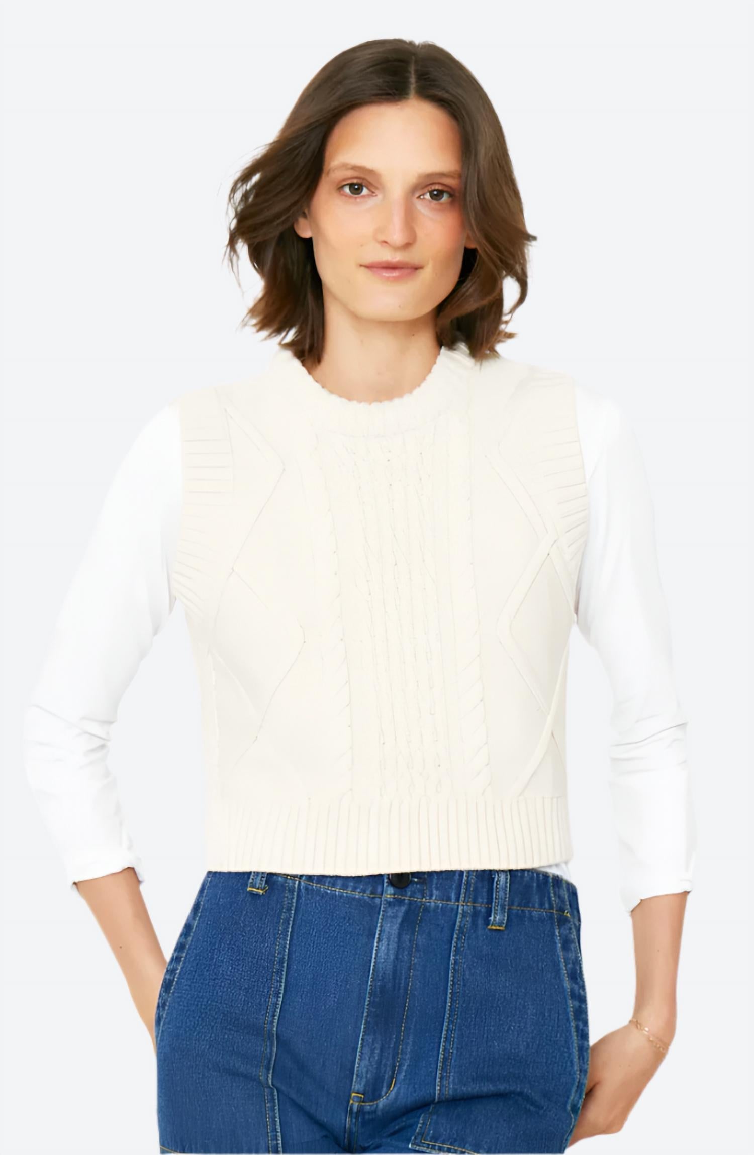Stay warm and stylish in this versatile and effortlessly cool knitwear staple. Wear it alone or layered, it's the perfect sweater for the season and you'll wish you had it in every color. Elevate your ensemble with The Van Vest by KULE, a cream-colored, chunky cable-knit piece. Crafted in a soft blend of 55% Merino Wool and 45% Cotton, this sleeveless vest features ribbed trim at the neck and armhole for a polished look. Its pull-on style lends itself to versatility, whether worn mountainside or in the office. Originating from an import collection, this vest requires dry cleaning to maintain its quality.