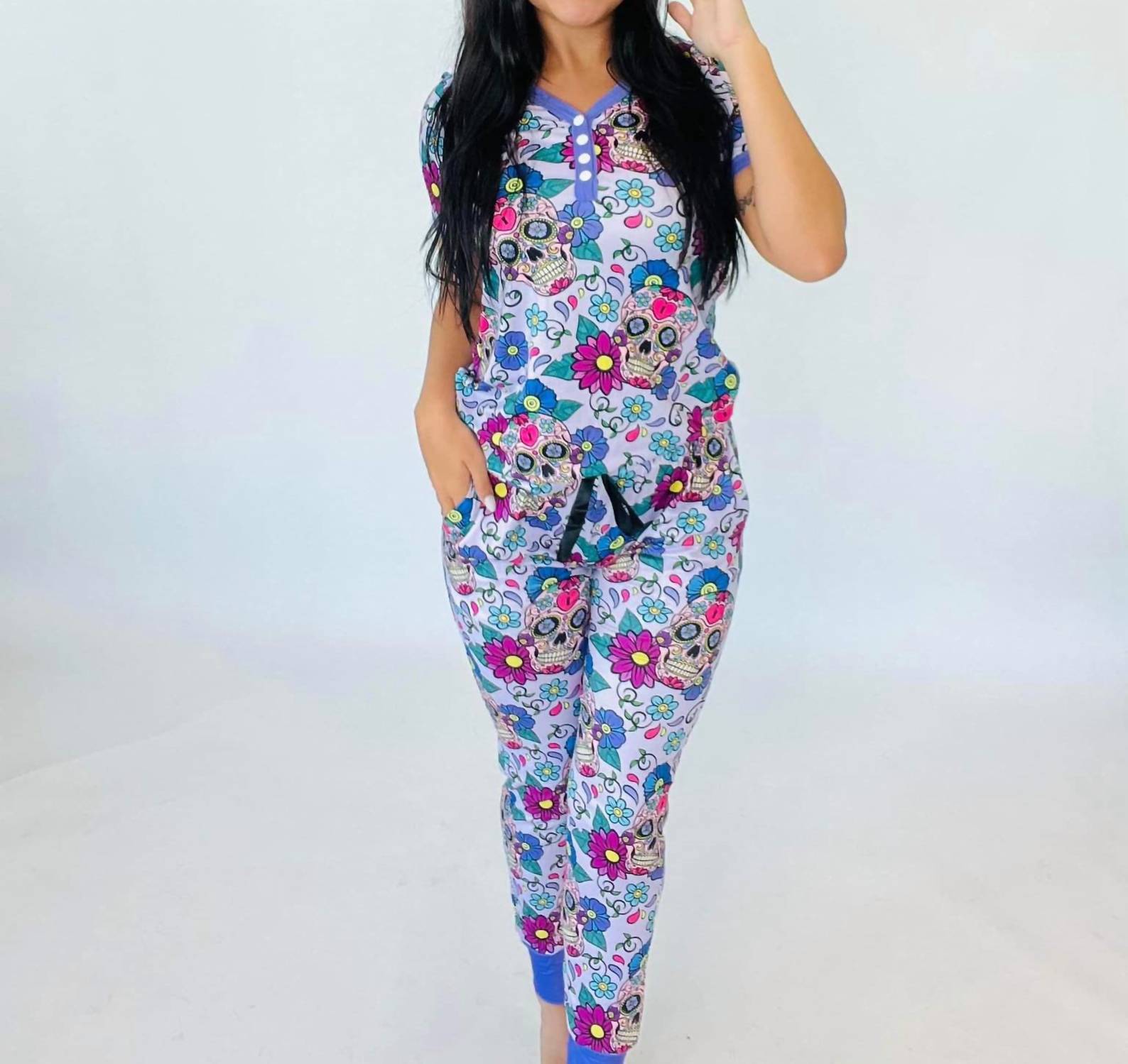 A set so cute you'll never want to take it off. Designed to look good while lounging, this little number is the perfect outfit for hanging at home in style. Introducing the Sugar Skulls Loungewear Set by Shirley Stone, designed for ultimate comfort and style in a vibrant multi-color pattern. This women’s set features short sleeves and is crafted from a superior blend of 93% Polyester and 7% Spandex, offering a buttery soft feel and amazing stretch. The top has a V-neck with faux button detailing, and the jogger bottoms include an adjustable drawstring elasticized waist for a perfect fit. Care for this Boho Chic set by hand washing in cold water, ensuring it stays in top condition for your Thanksgiving gatherings and summer vacations.