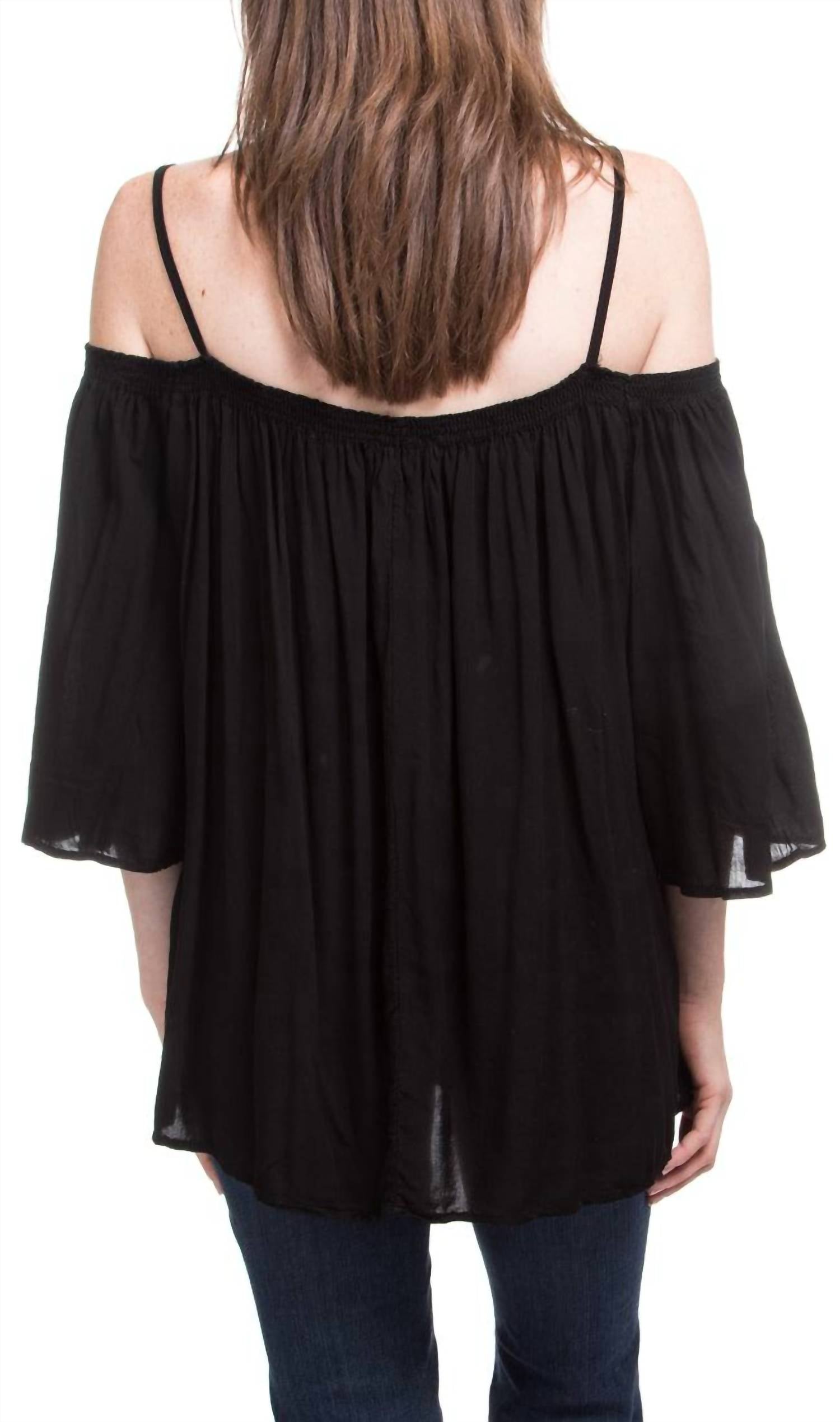 A versatile blouse that works from desk to dinner! Introducing the Arianna Square Neck Top by GIGI MODA, a stunning black blouse perfect for any occasion. This women's blouse features three-quarter sleeves and a chic cold shoulder design with thin straps. Made from 100% viscose, it is expertly crafted in Italy and offers a stylish pull-on closure. To maintain its elegance, hand wash and line dry this beautiful piece.