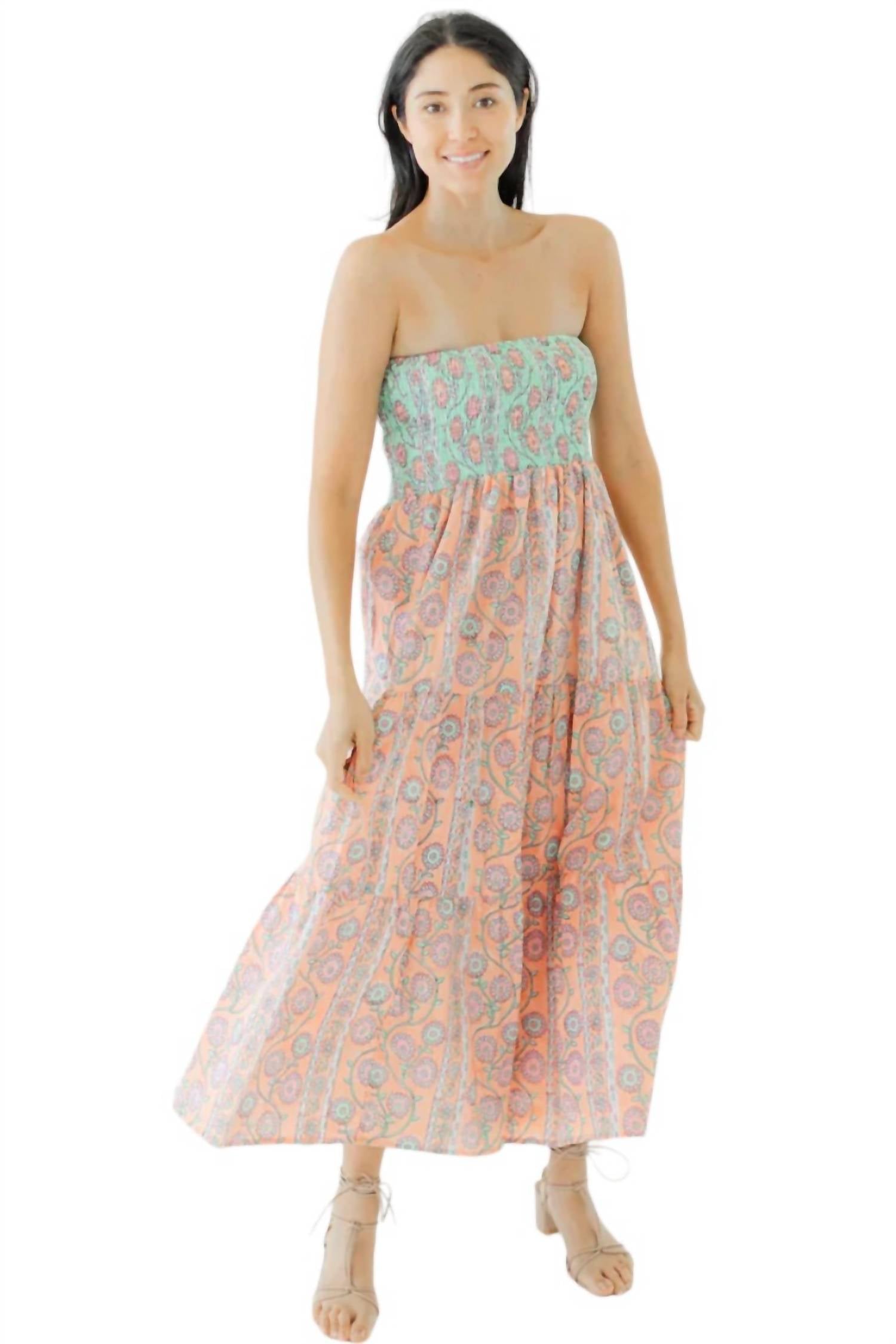 This Santa Fe Midi Dress features a floral pattern and is made from 100% organic cotton. With a strapless, off-the-shoulder design, smocked bodice, A-line silhouette, and tiered skirt, it offers both elegance and practicality with side pockets for convenience.