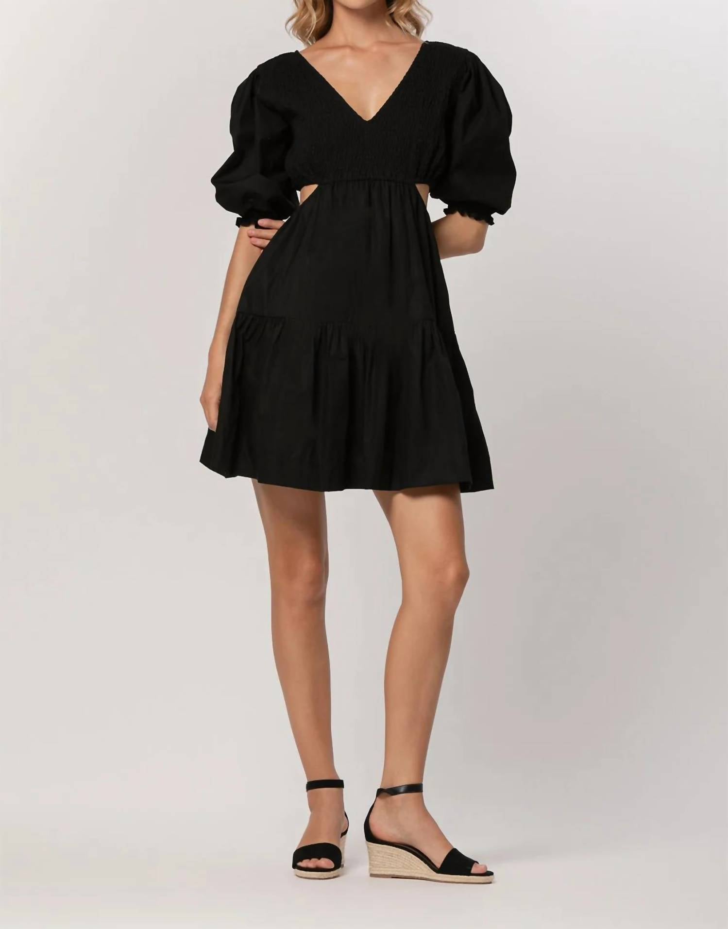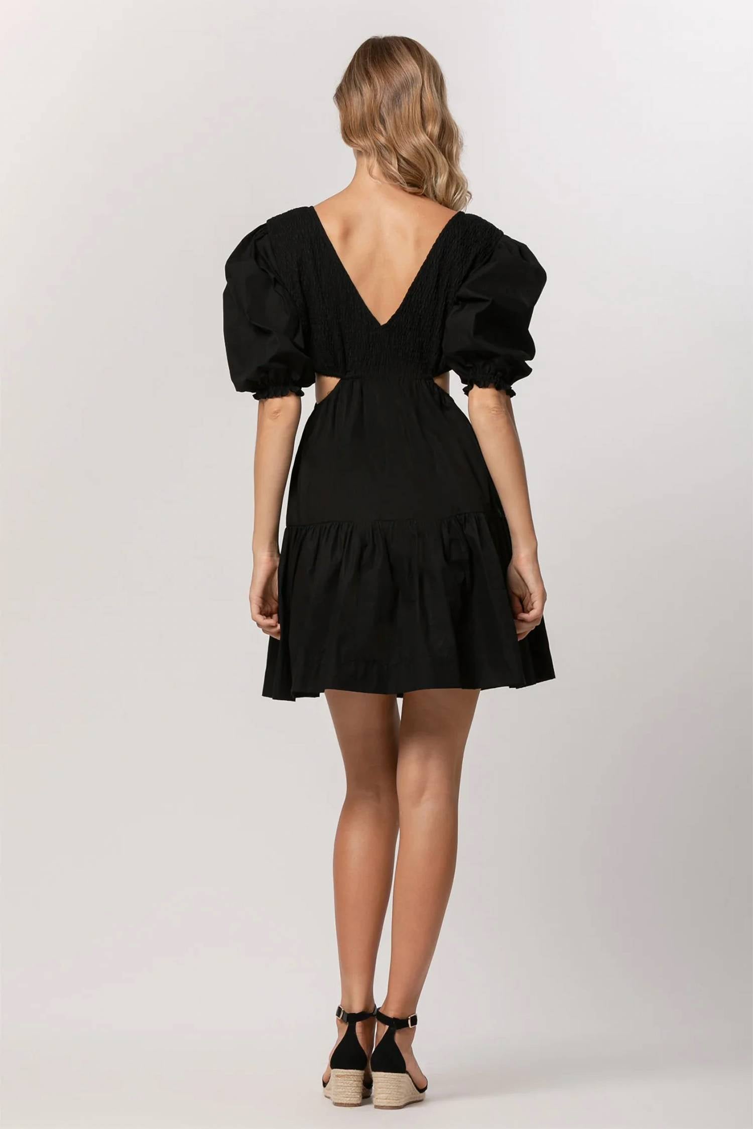 The perfect mini dress for those warmer months. The Brooke Mini Dress by LUSANA is a chic addition to any wardrobe, ideal for a stylish day out. This women's mini dress comes in a timeless black color and features a deep V-neckline with short sleeves. Crafted from 100% GOTS-Certified Organic Cotton Poplin, it boasts a flattering A-line silhouette and a convenient pull-on closure. With shirred bodice, tiered skirt, and waist cut-out details, this 36-inch dress offers a perfect blend of elegance and comfort.