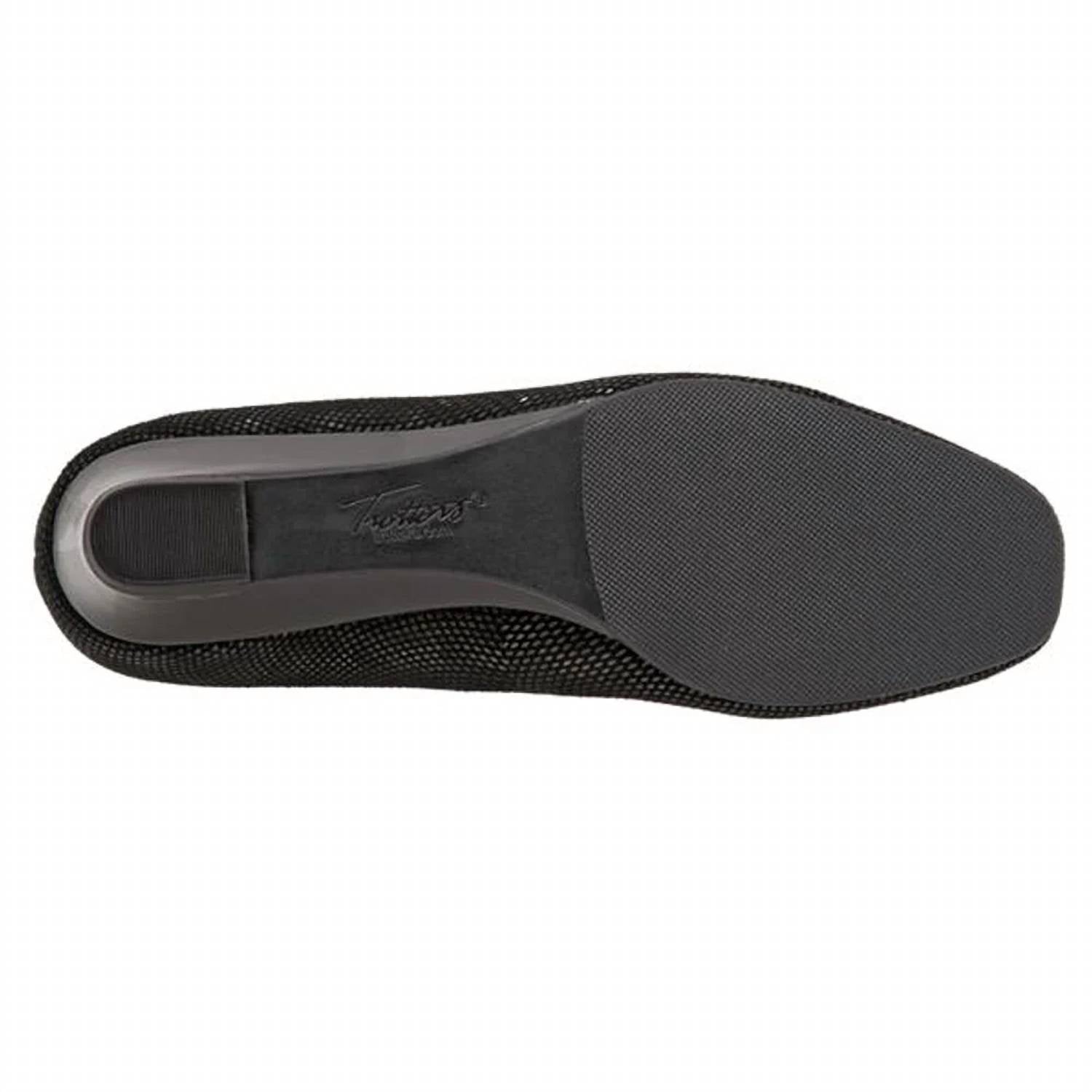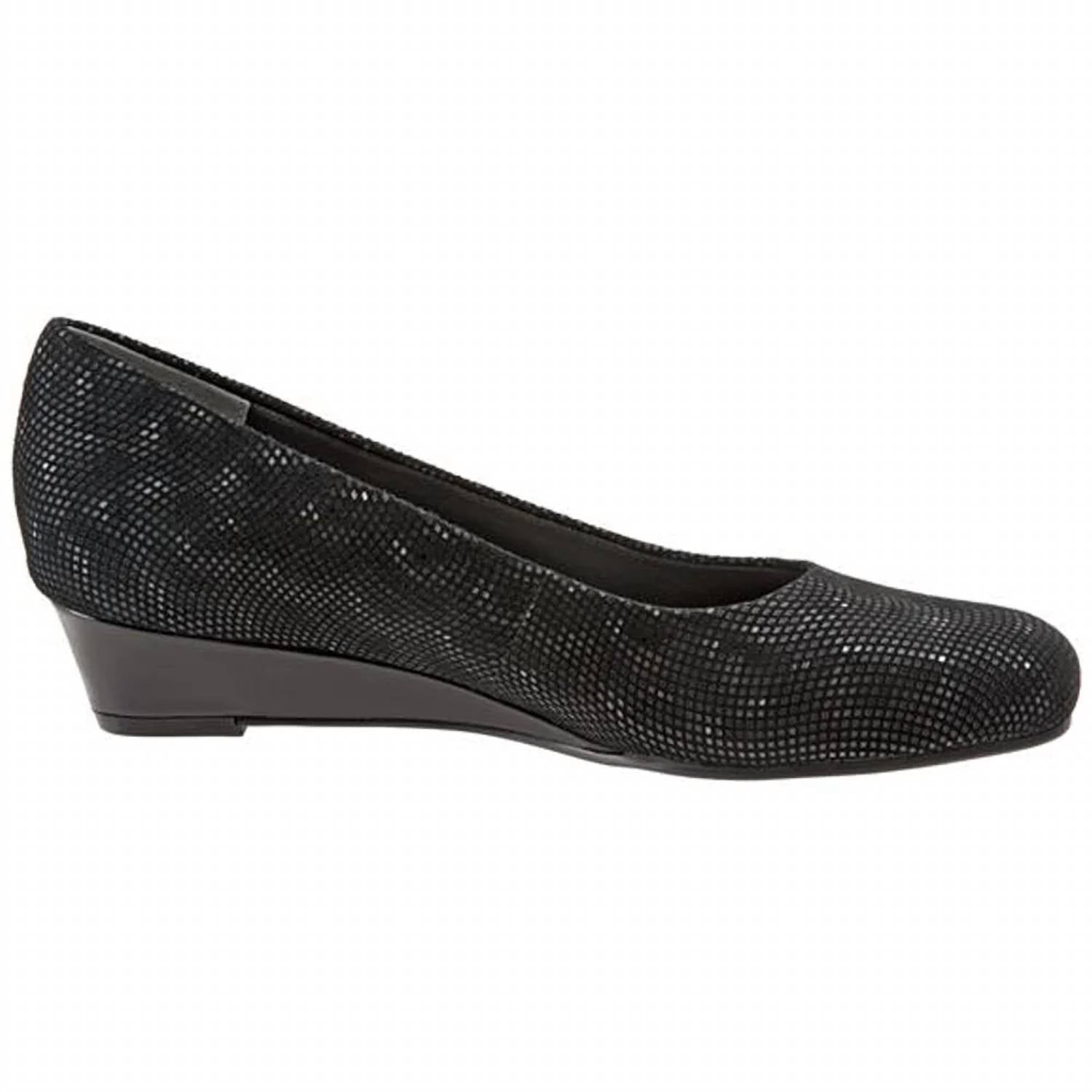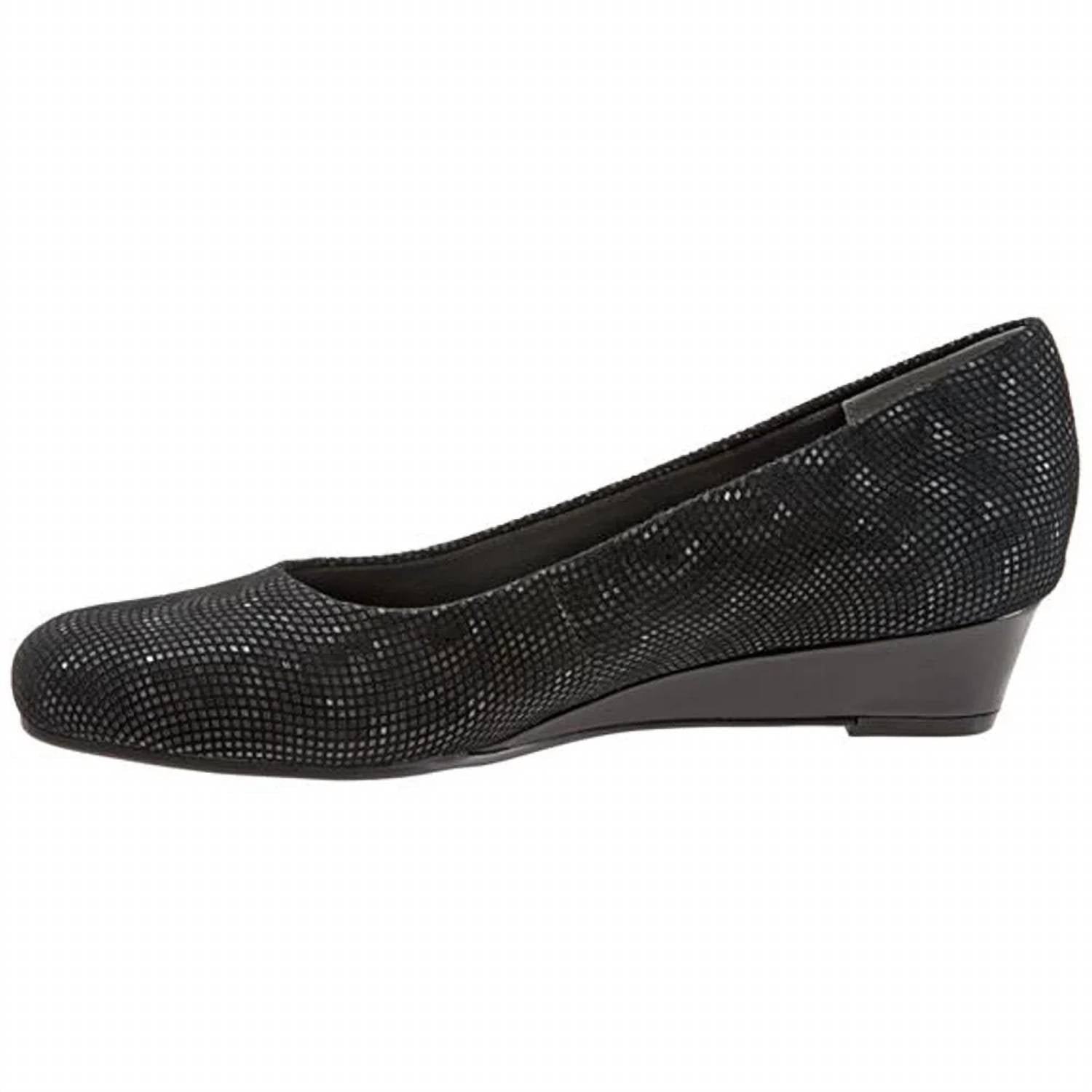 Elevate your footwear game with these adorable wedges. Elevate your style with the Women's Lauren 3d Patent Suede Shoes by Trotters, expertly crafted for discerning fashionistas. Featuring a low wedge heel height of approximately 1 1/4 inches, these shoes provide comfort and style with a cushioned polyurethane footbed. The elegant black leather upper is complemented by an antimicrobial tricot fabric upper lining and a slip-resistant flexible rubberized sole, ensuring both chic aesthetics and practicality. The squared toe design adds a modern touch to this timeless piece.