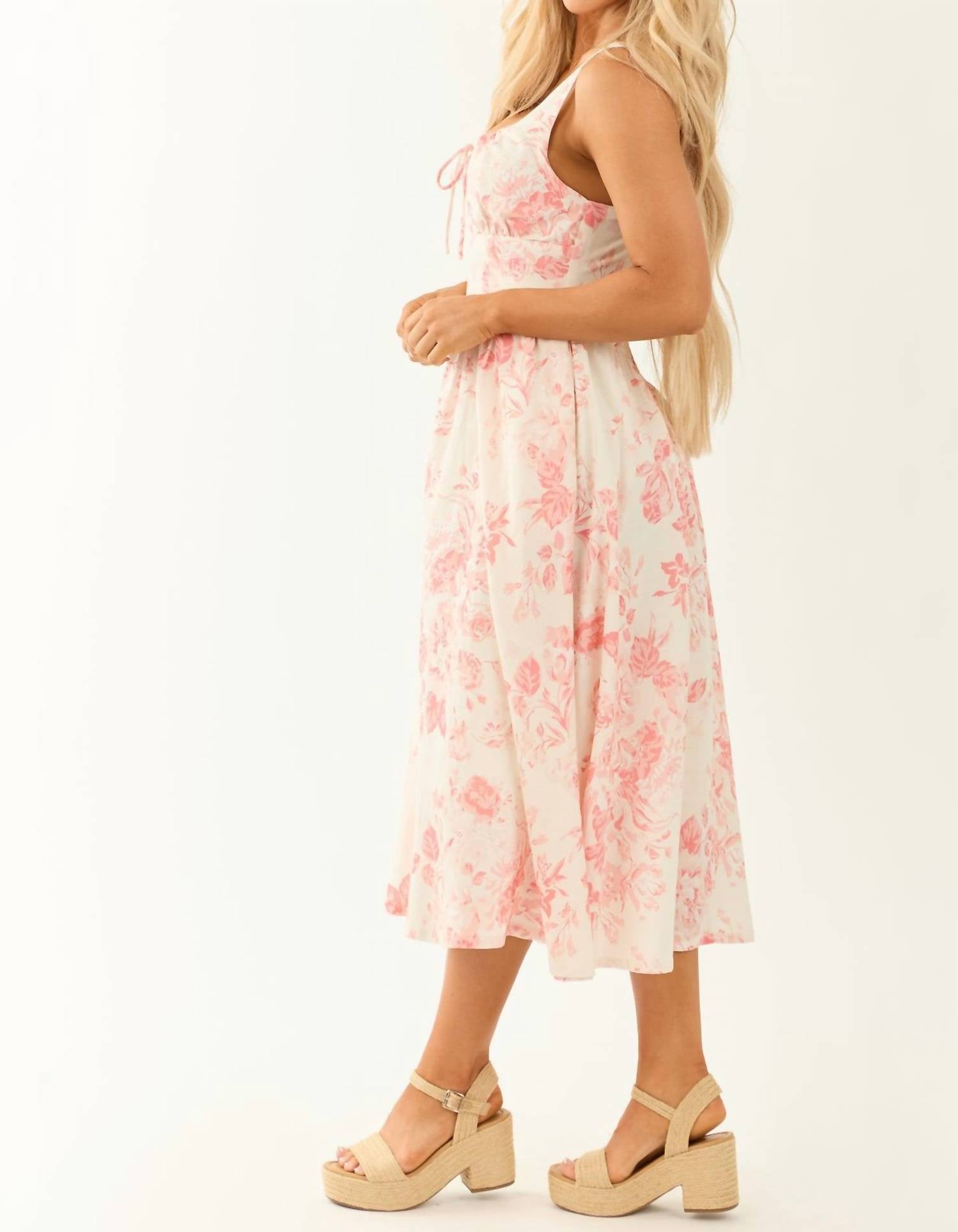 The perfect length dress does exist. Discover the Bustier Fit and Flare Dress by ee:some, designed to embody elegance and charm in every detail. This sleeveless, tea-length dress is crafted from 100% cotton, presenting a soft and breathable touch, enhanced by a lovely floral pattern in a Rose Tea shade. Featuring a structured bustier top with a zip closure and a square neckline, it offers both comfort and style, perfect for spring occasions like cocktail parties. Care instructions recommend machine washing with a line dry for easy maintenance. Model is 5'7" and wears a small.