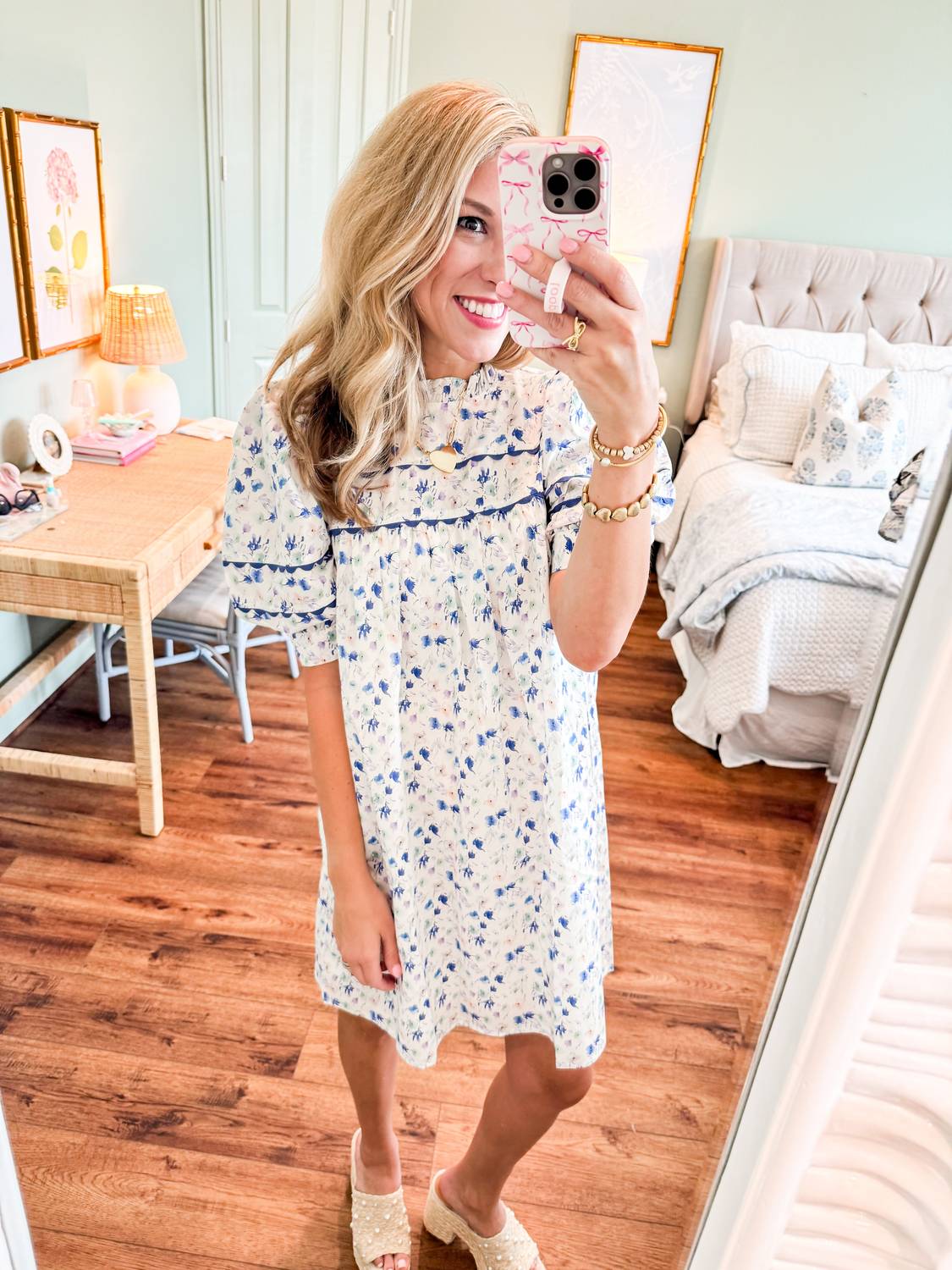 Comfortable and cute, this casual day dress has it all. Embrace the sweet and timeless style of the Aegean Bloom Short Sleeve Dress by Meet Me in Santorini, perfect for spring occasions. This shift dress in a multi-colored floral pattern features charming short puff sleeves and a ruffled high neckline, accentuated with contrast lace trim. Enjoy the ease of a pull-on closure, designed with a relaxed silhouette for comfort and versatility. Care for this piece is simple: machine wash and lay flat to dry.