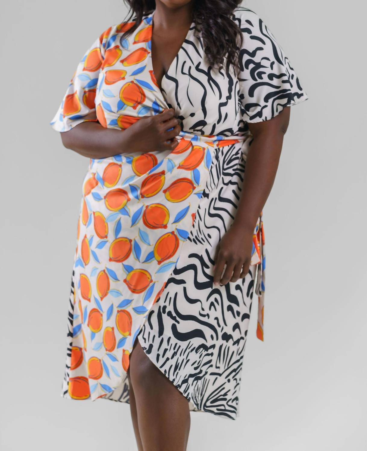 The perfect length dress does exist. Meet the Pandora V-neck Midi Dress by Donna Morgan, a perfect blend of elegance and flair. This distinctive wrap dress comes in a vibrant Ivory Black Lemon colorway featuring a chic graphic pattern and is crafted from 100% polyester. It showcases short dolman flutter sleeves and a flattering tulip skirt for a sophisticated silhouette. Designed with a tie closure for easy wear, care for this piece by machine washing and line drying.