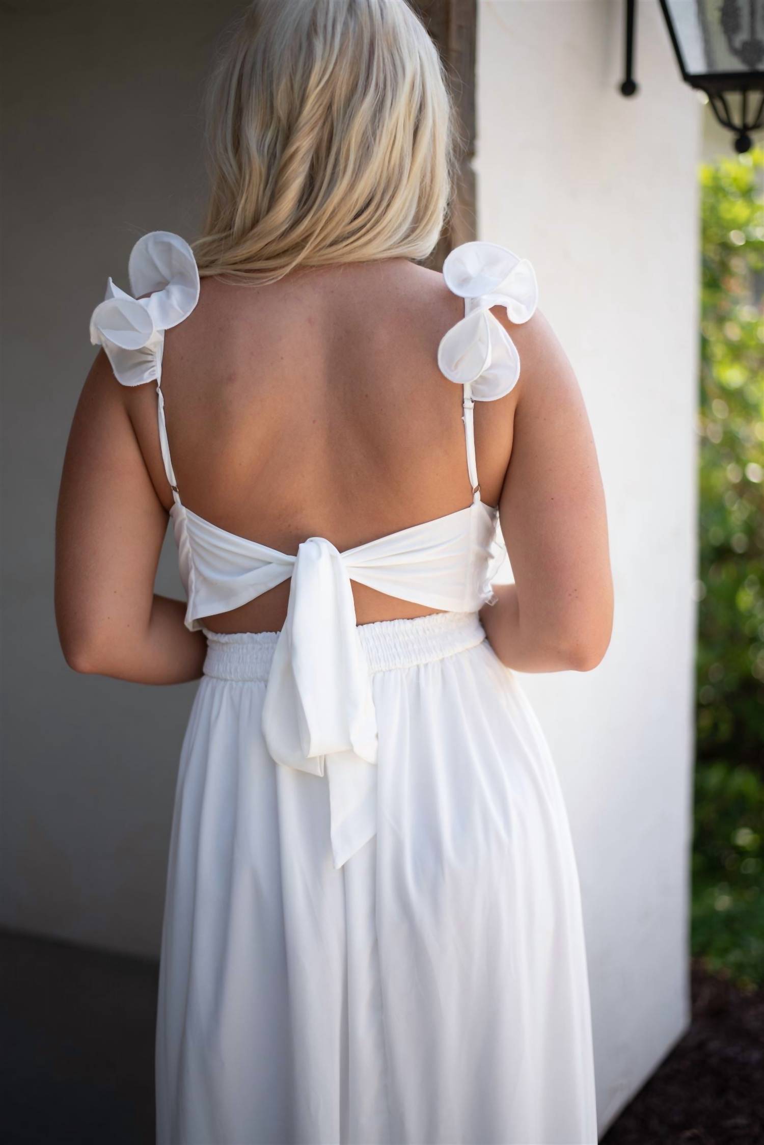 Who doesn't love a good maxi dress? This one you'll be reaching for season after season. Introducing the Women's Luna Ruffle Maxi Dress by Main Strip, a stunning piece in Off White perfect for summer. This sleeveless dress features a fit and flare silhouette with a sophisticated V-neckline and elegant ruffle details. The tie closure at the back provides a customizable fit, making it ideal for vacation or refined everyday wear. Embrace the elegant streetwear trend with this solid, comfortable, and effortlessly stylish maxi dress.