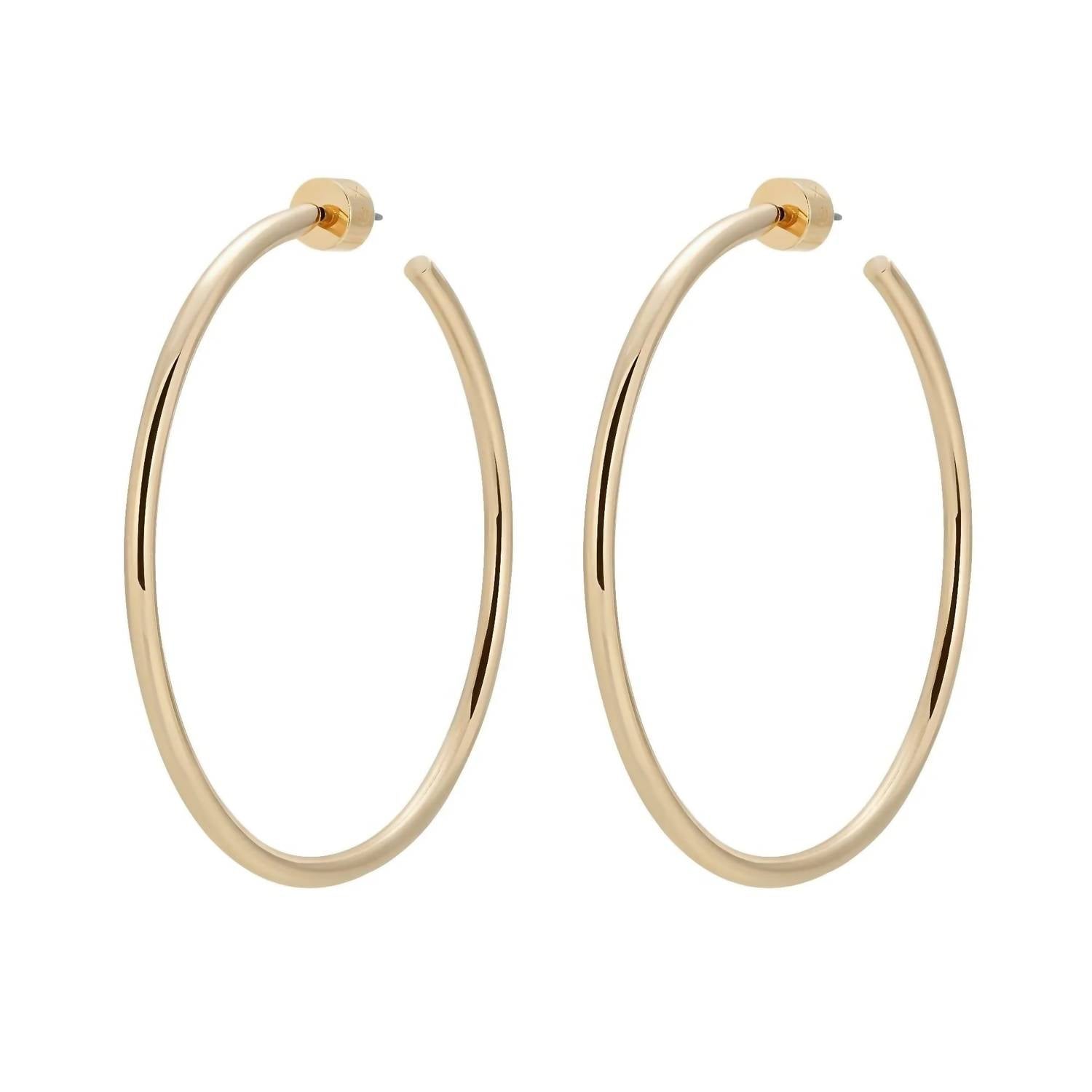 Easy and elegant earrings to complement any outfit. Elevate your style with Eklexic's Women's 2" Ultimate Hoops, a bold earring choice in elegant Gold. Crafted from recycled brass with a quality construction, these hoops feature a striking 2" diameter and a luxurious 14K yellow gold finish for a touch of sustainable sophistication. Designed for comfort and long-term wear, these earrings are the perfect modern luxury accessory. Closure: Push back.