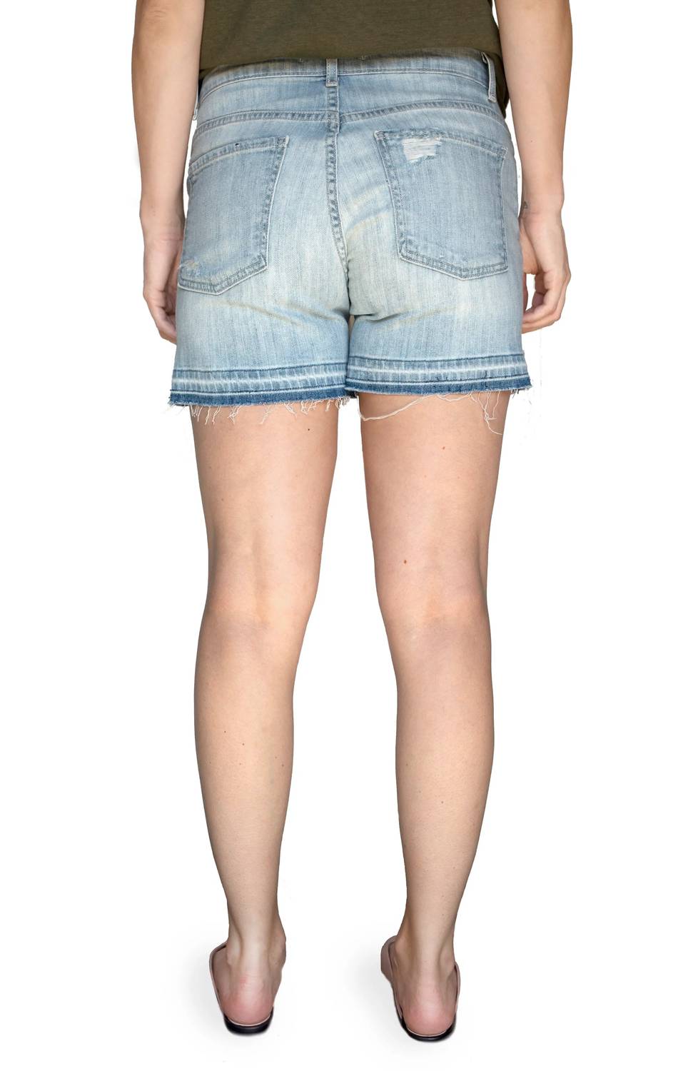 You can never have too many jean shorts and these will be your new favorites. Discover the Malibu Girlfriend Shorts by FIDELITY, a perfect blend of vintage charm and contemporary style. These light-blue denim shorts feature a high waist and a stylishly ripped, faded wash, crafted from a comfortable stretch denim with a composition of 98% cotton and 2% elastane. Made in the USA, they boast a trendy leggy silhouette with a 3-inch inseam, accented by released raw hems and a 16-inch leg opening. With a zip closure, five-pocket styling, and practical care instructions allowing for machine washing and tumble drying, these shorts are as functional as they are fashionable.