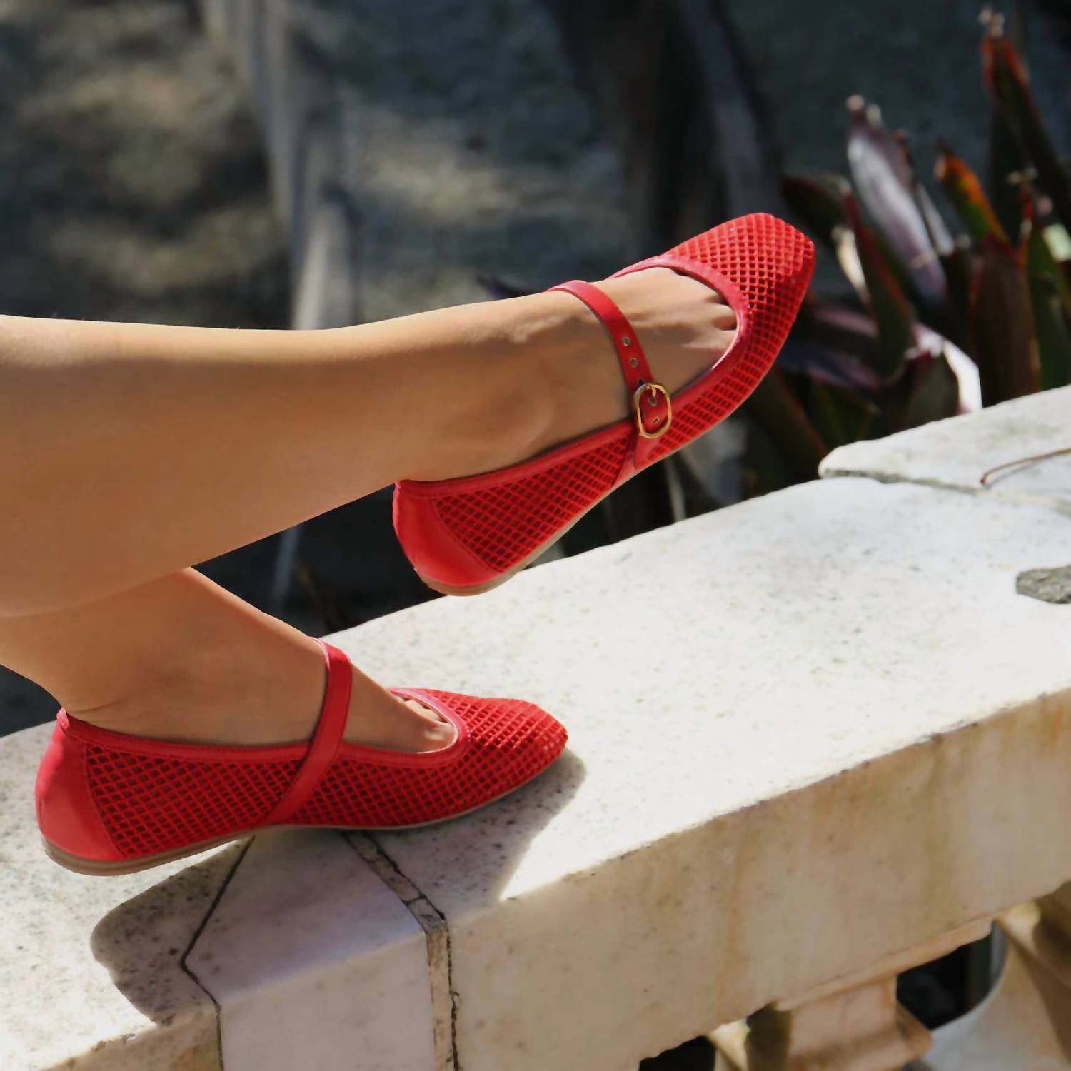 A preppy yet feminine take on the classic loafer. Embrace warm days with the Women's Rodni Ballet Flat Shoes by Dolce Vita, designed in striking Chili Woven Mesh. These classic Mary-Jane ballet flats feature a breathable mesh outer for chic, effortless style perfect for spring and summer. Material: Leather. Step into eco-conscious fashion with a commitment to sustainable materials.