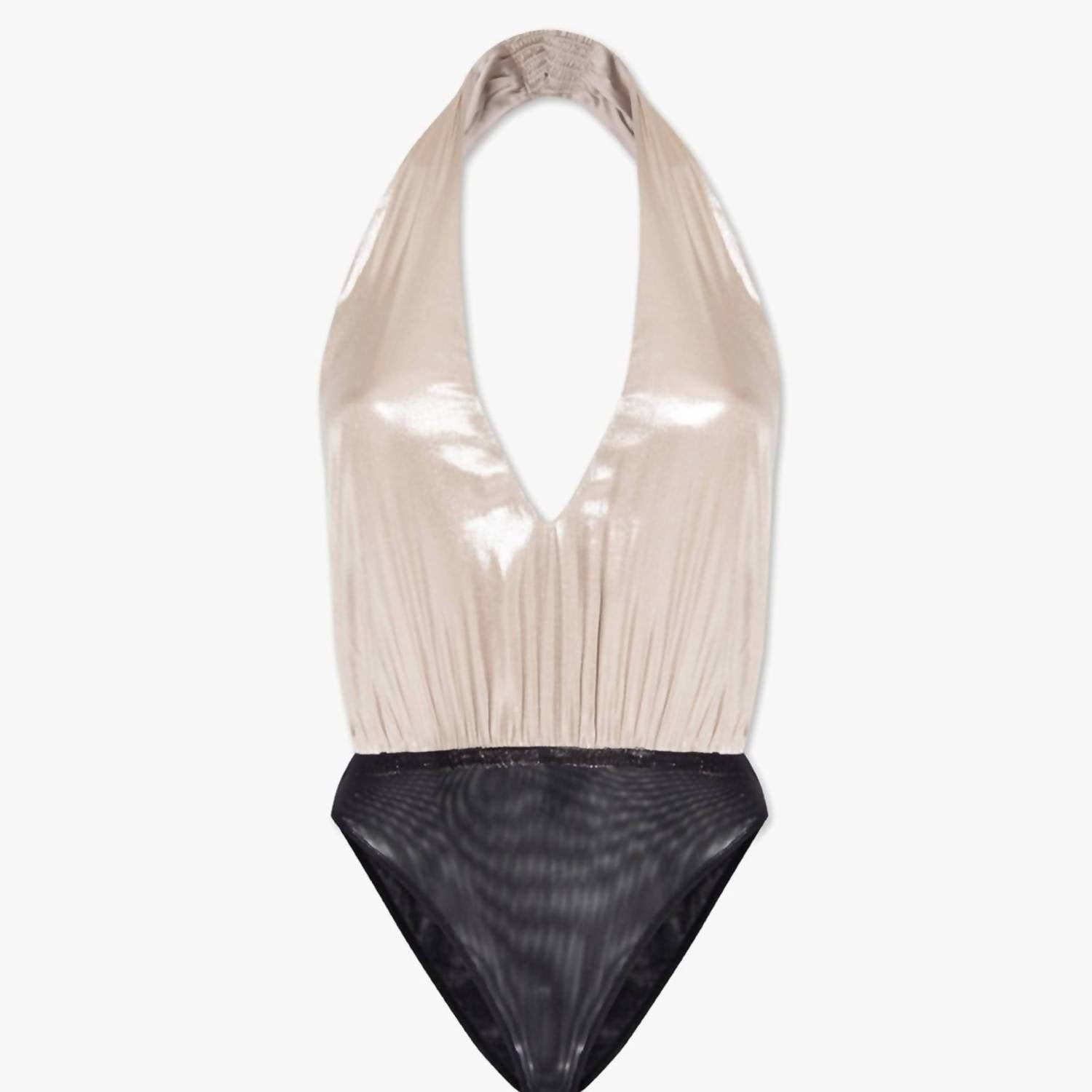 Pair this number with your favorite high-waisted jeans. Introducing the Dora Plunge Bodysuit by AllSaints, a stunning piece crafted from 100% shiny satin polyester in a chic Champagne Pink. This sleeveless bodysuit features a halter neck and plunging V-neckline for an alluring look, while the daring open back adds a touch of boldness. It offers cheeky coverage with comfortable elastic stretch at the neck and a snap closure at the crotch for convenience. Imported and perfect for vacation, this bodysuit requires hand wash and should be laid flat to dry.